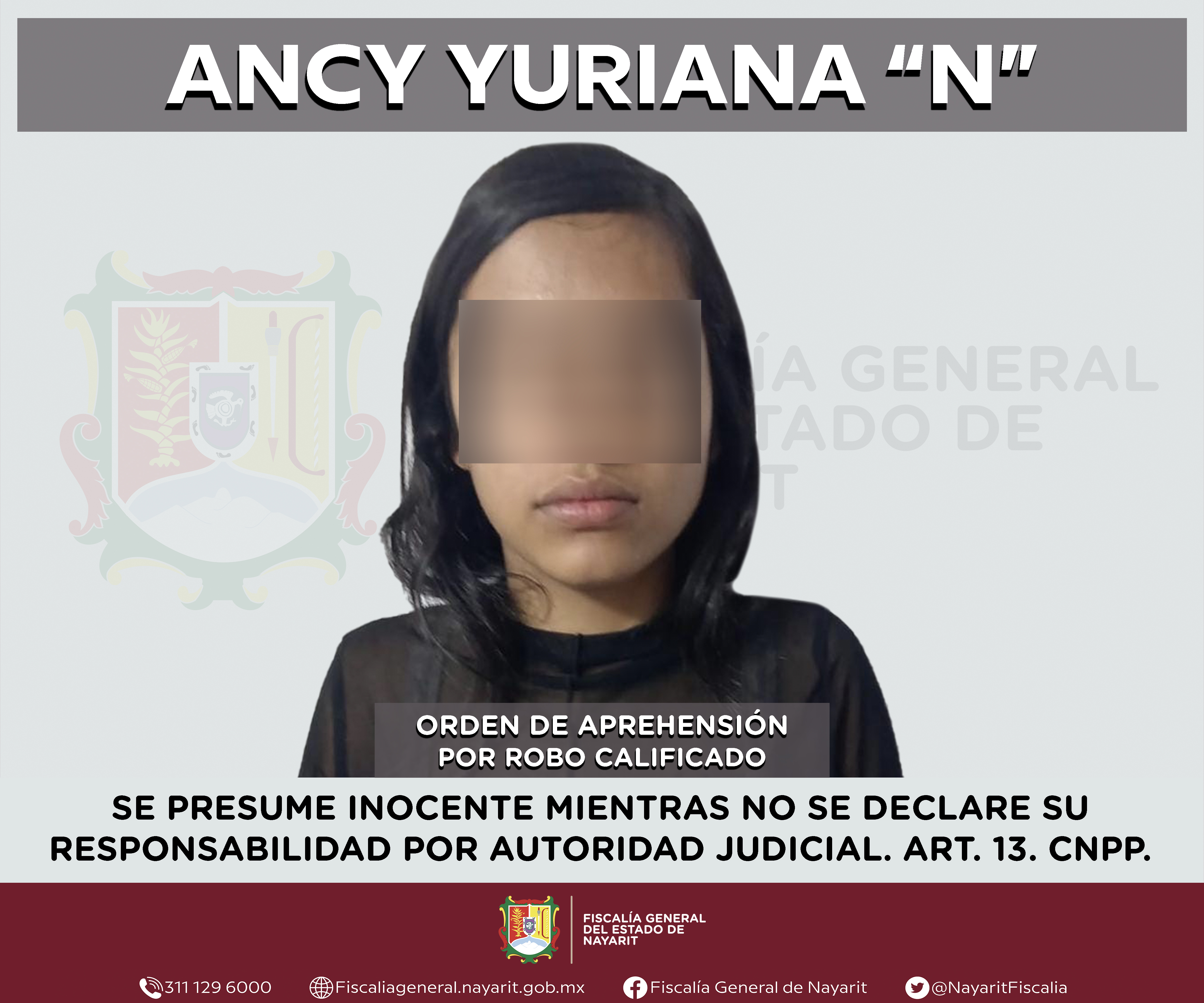 La Fiscalía General de Nayarit a través de la Agencia de Investigación Criminal ejecutó una orden de aprehensión en la ciudad de Tepic contra Ancy Yuriana “N”, por su probable participación en hechos que para la ley configuran el delito de robo...