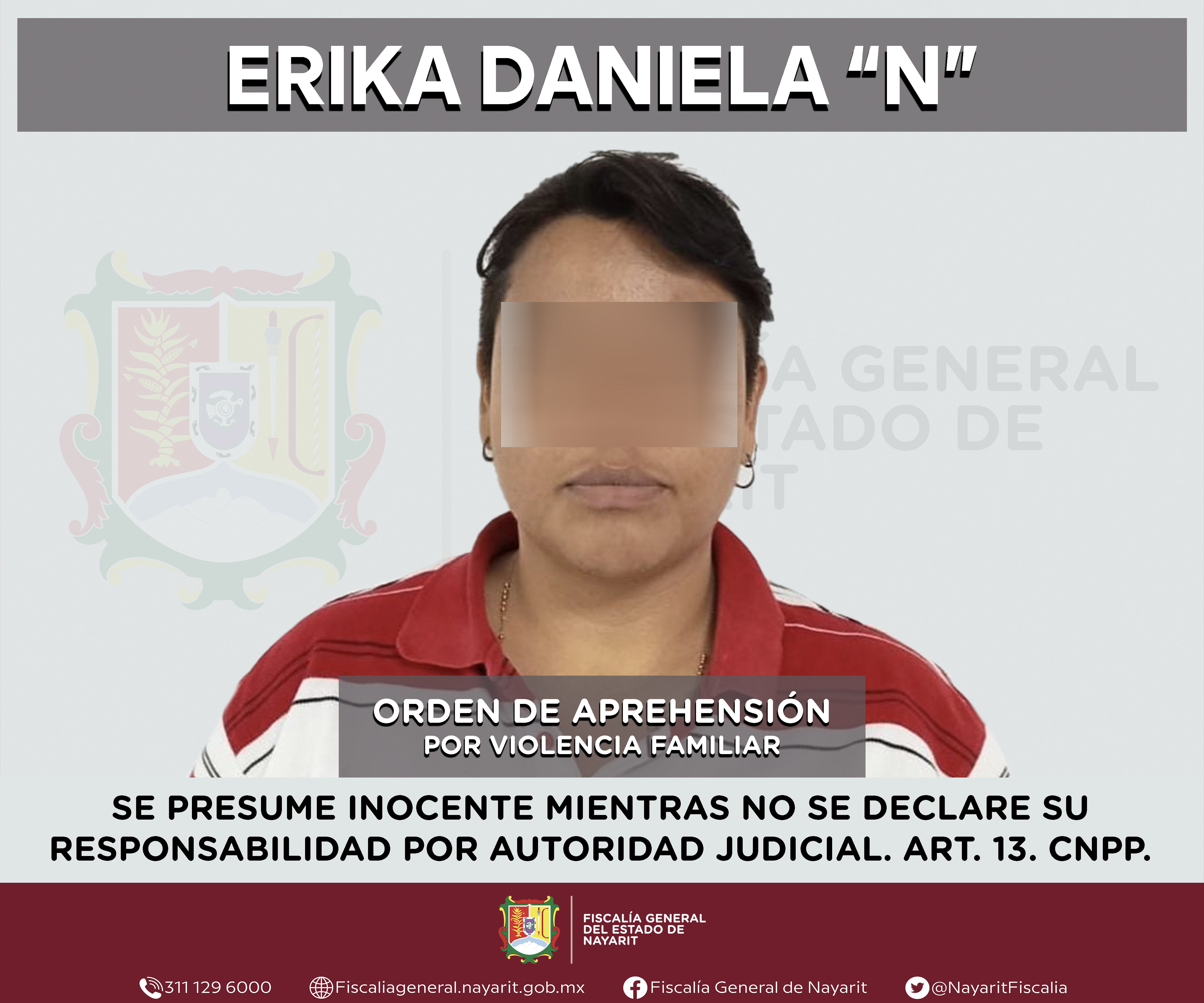 La Fiscalía General del estado de Nayarit a través de la Agencia de Investigación Criminal ejecutó una orden de aprehensión en la capital nayarita contra Erika Daniela “N”, por su presunta participación en hechos que según valoración de la le...