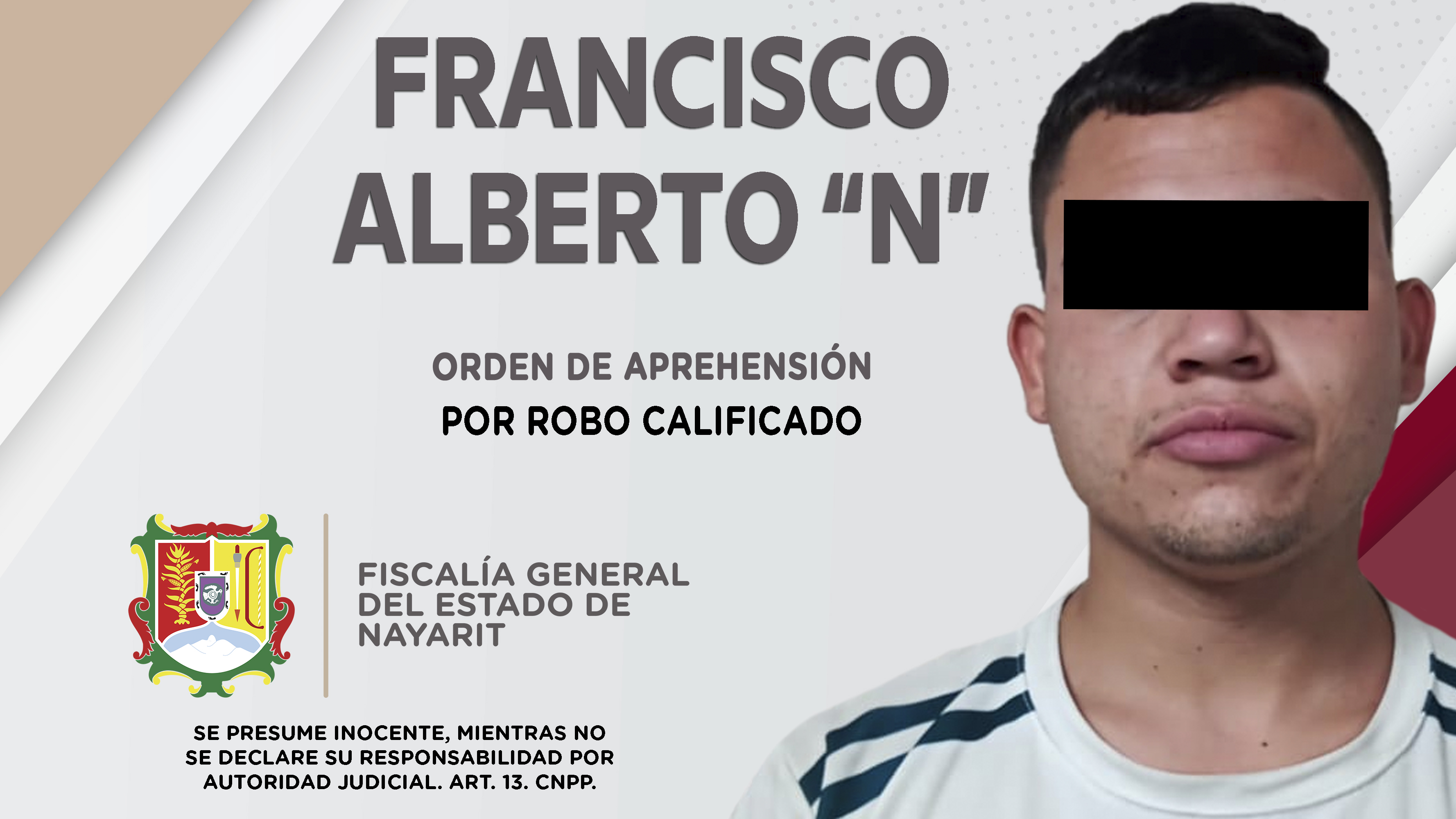 Elementos de la Agencia de Investigación Criminal cumplimentaron una orden de aprehensión en la ciudad de Tepic contra Francisco Alberto “N”, por su presuntiva responsabilidad penal en hechos que la ley califica como delito de robo calificado, ilí...