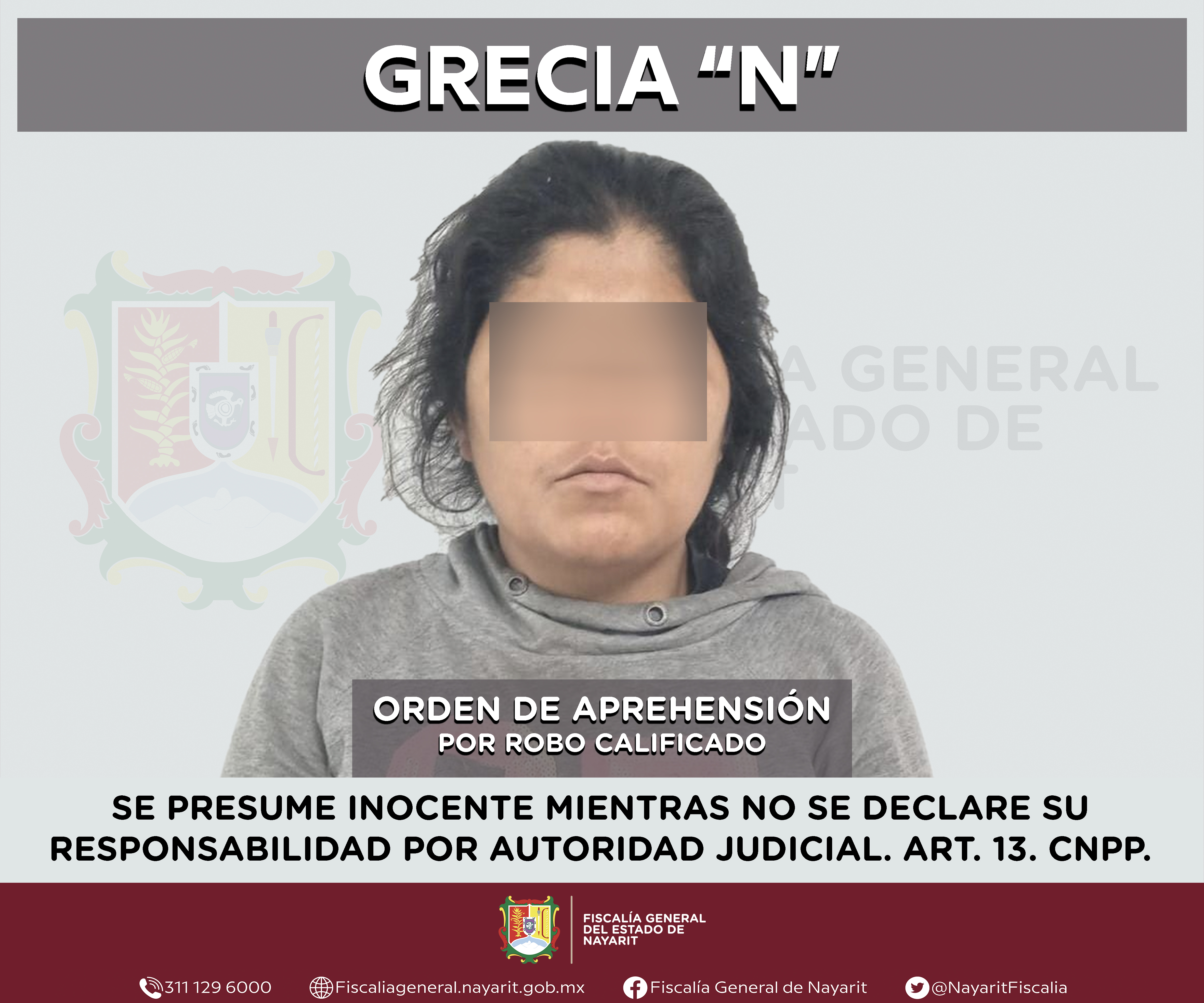 Elementos de la Agencia de Investigación Criminal de Nayarit ejecutaron una orden de aprehensión en Tepic contra Grecia “N”, por su presunta participación en hechos que según valoración de la ley configuran el delito de robo calificado, cometido...