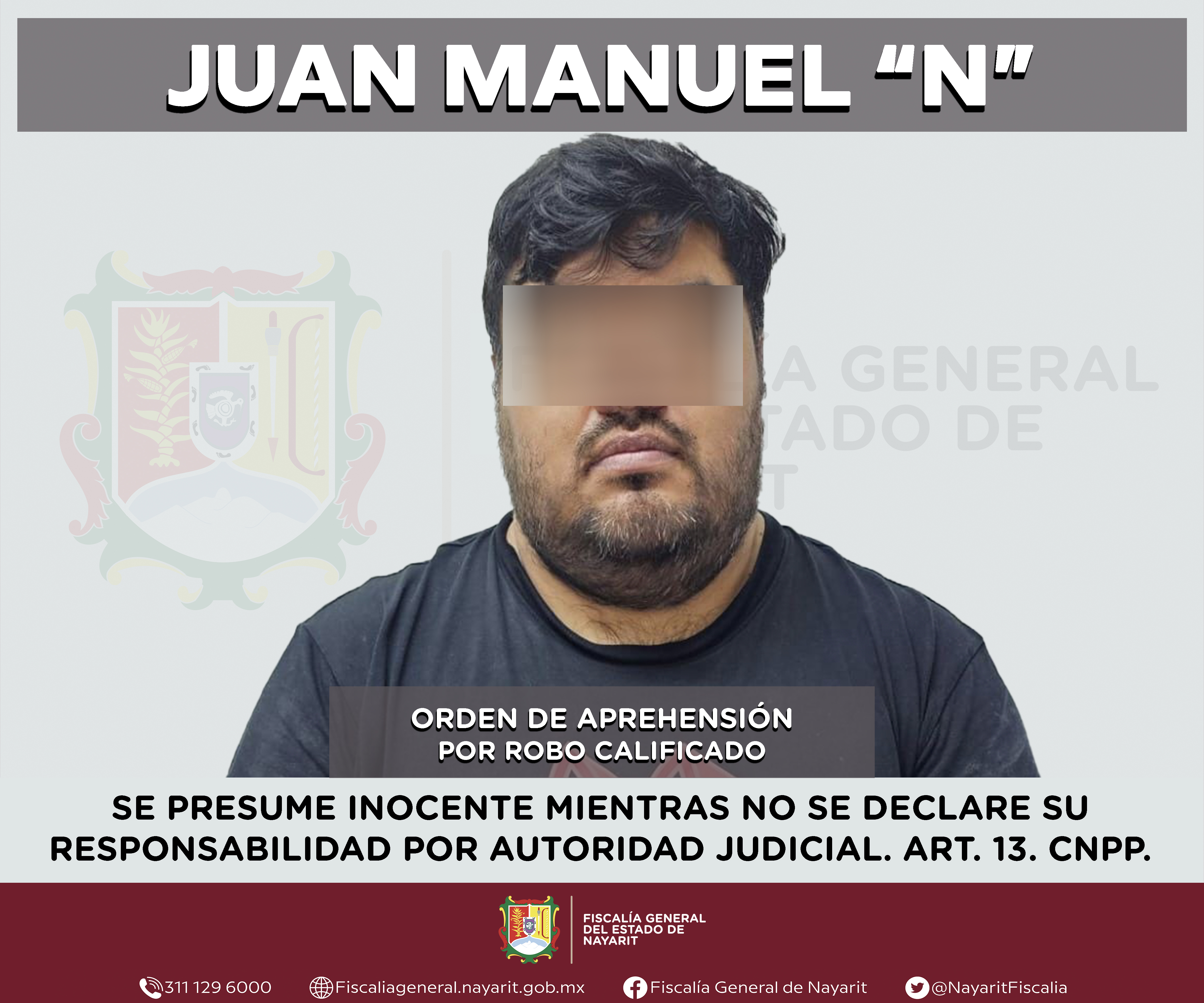 La Fiscalía General de Nayarit a través de la Agencia de Investigación Criminal ejecutó una orden de aprehensión en la ciudad de Tepic contra Juan Manuel “N”, por su probable participación en hechos que para la ley configuran el delito de robo ...