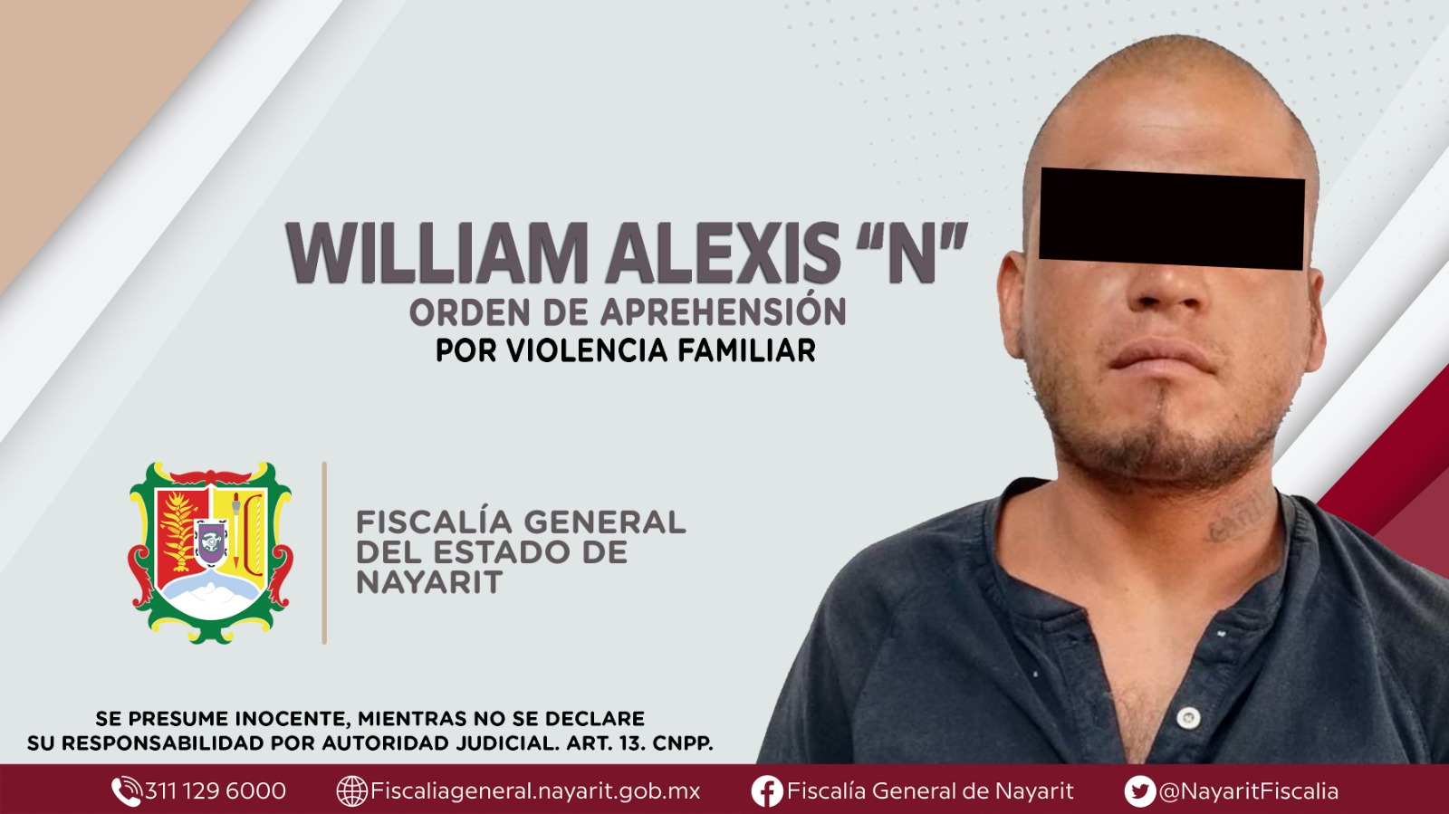 Elementos de la Agencia de Investigación Criminal de Nayarit ejecutaron una orden de aprehensión contra William Alexis “N”, por su presunta participación en hechos que según apreciación de la ley encuadran el delito de violencia familiar, ilíci...