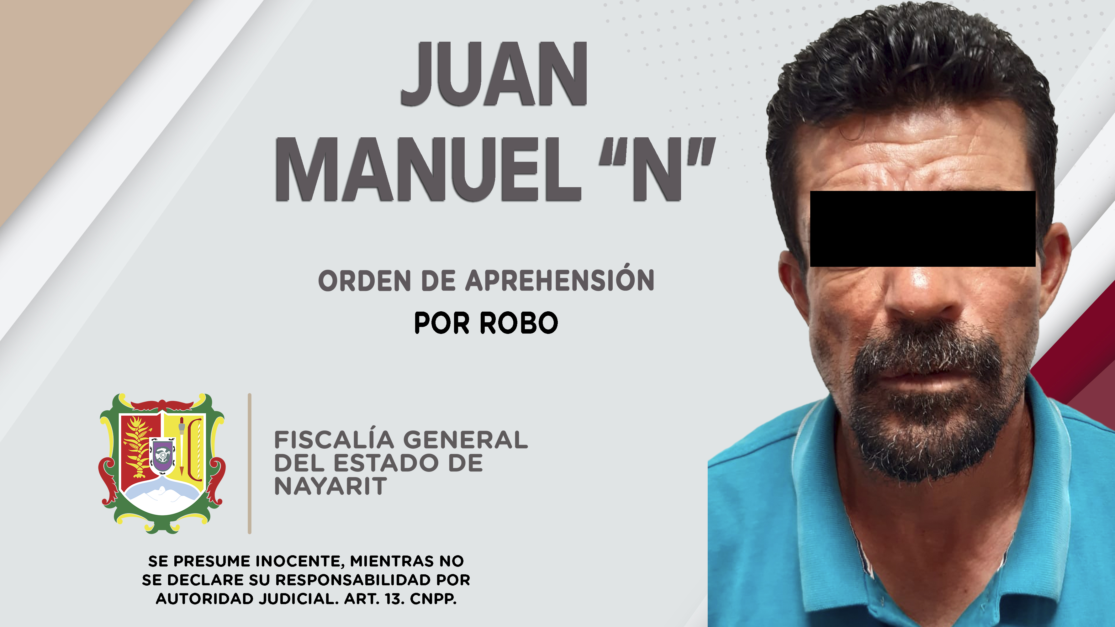 Fiscalía General de Nayarit a través de la Agencia de Investigación Criminal, ejecutó una orden de aprehensión en la ciudad de Tepic contra Juan Manuel “N”, por su probable participación en hechos que la ley califica como delito de robo, cometi...
