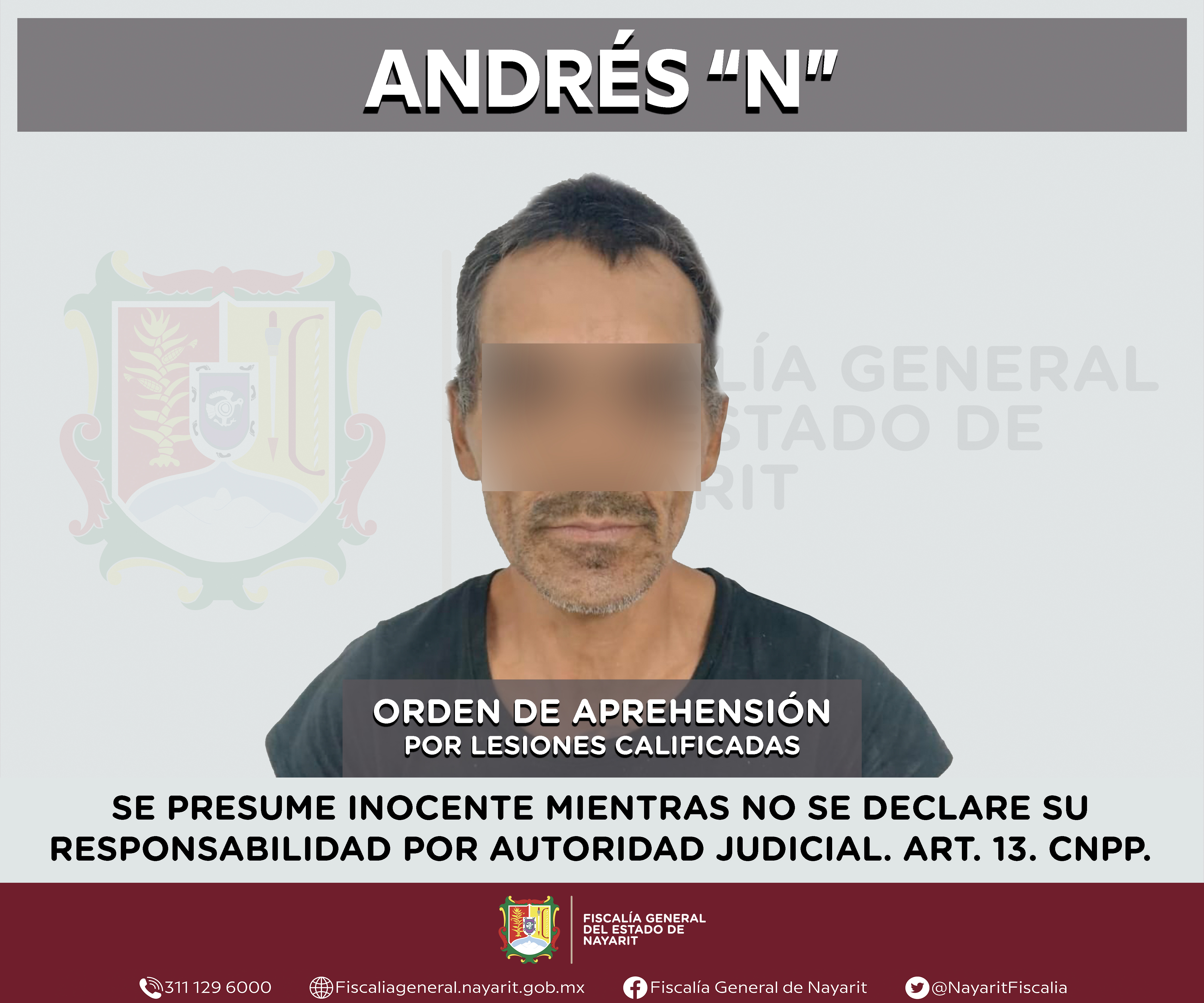 En la capital nayarita, elementos de la Agencia de Investigación Criminal dieron cumplimiento a una orden de aprehensión que se obsequió contra Andrés “N”, por su probable participación en hechos que la ley califica como delito de lesiones calif...