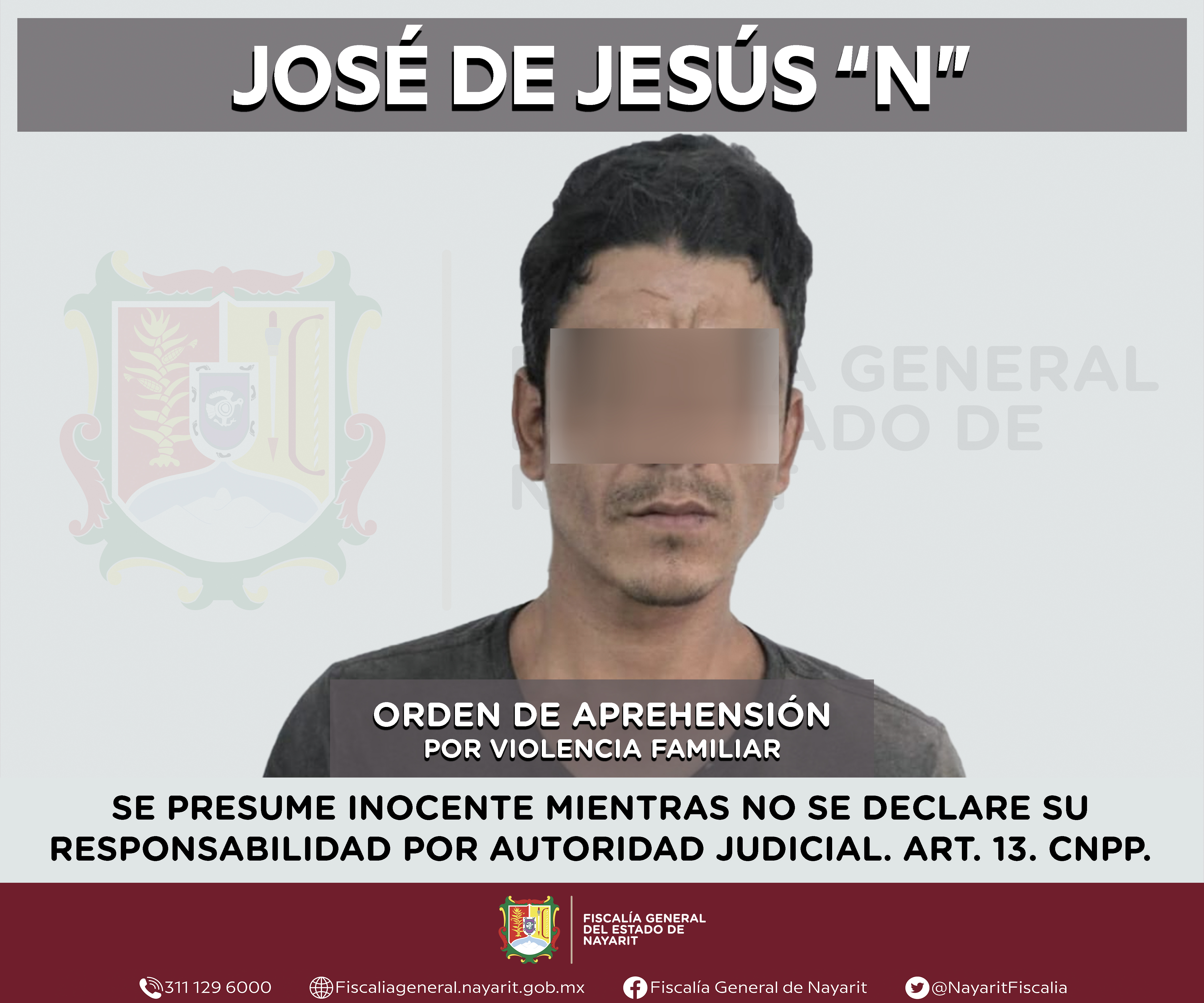 La Fiscalía General del Estado a través de la Agencia de Investigación Criminal dio cumplimiento a una orden de aprehensión en la localidad Lo de Lamedo, municipio de Tepic contra José de Jesús “N”, por su presunta participación en hechos que ...