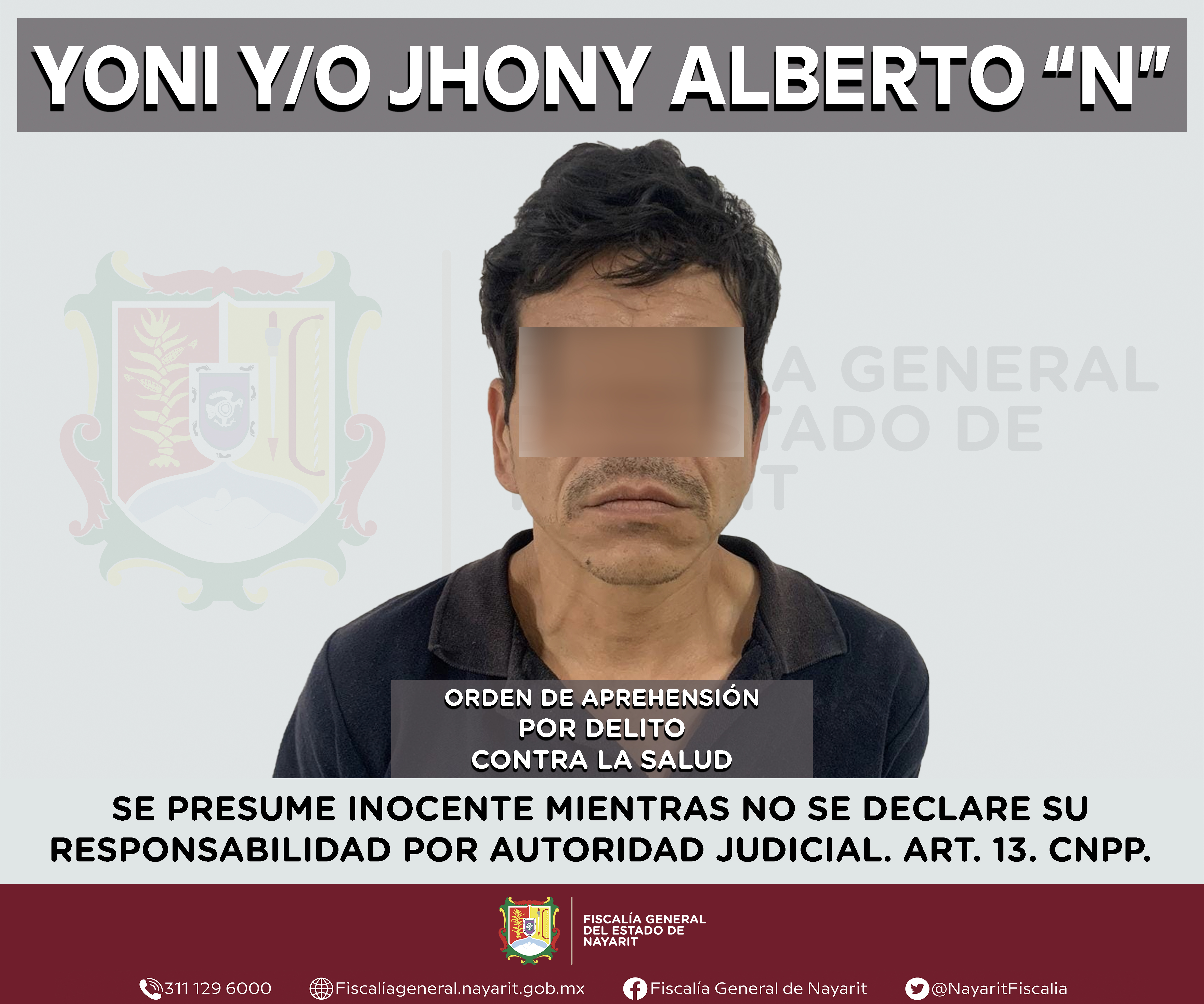 La Fiscalía General del Estado a través de la Agencia de Investigación Criminal dio cumplimiento a una orden de aprehensión en la ciudad de Tepic contra Yoni y/o Jhony Alberto “N”, por su presunta participación en hechos que según apreciación ...