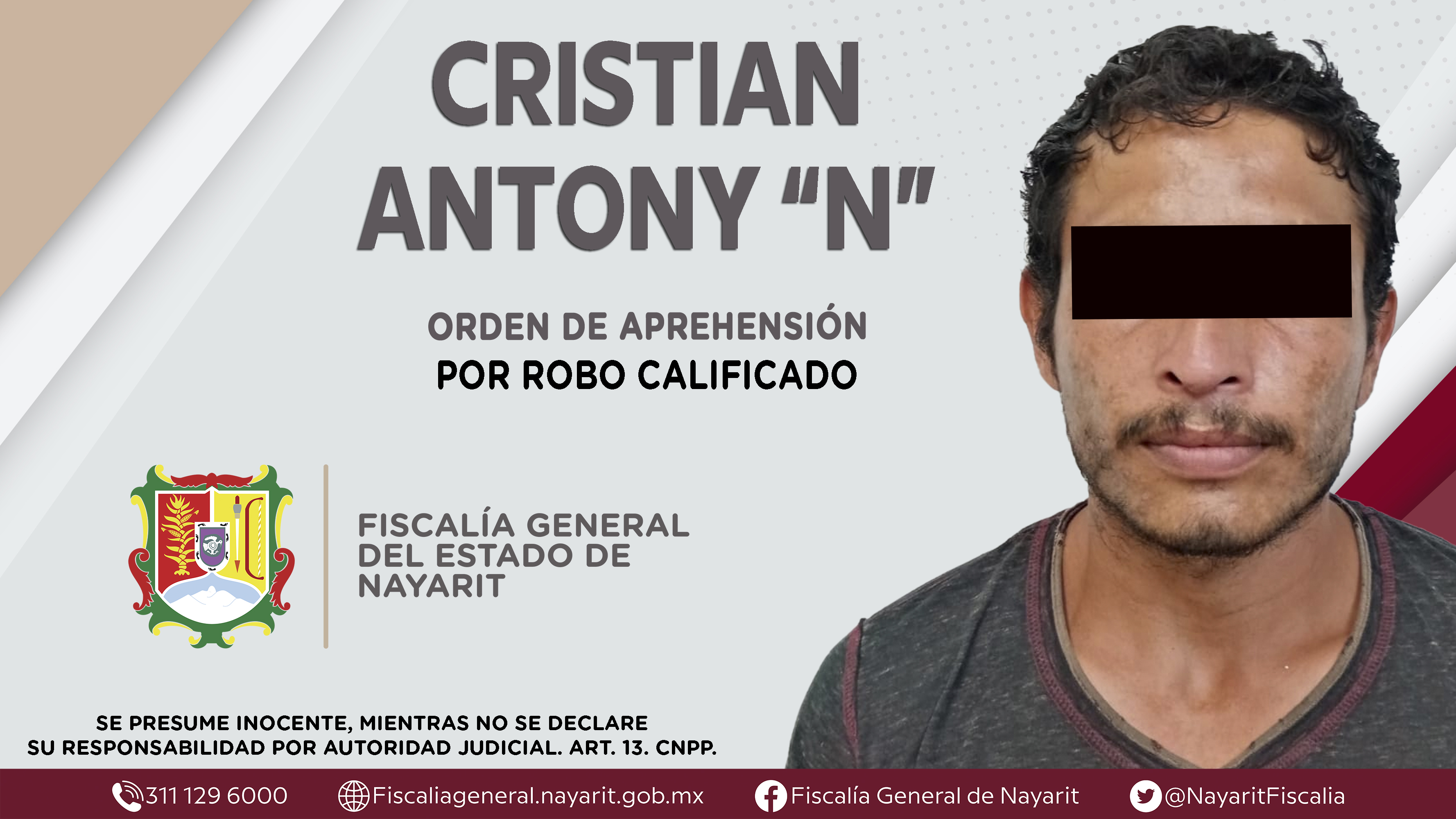 Fiscalía General de Nayarit a través de la Agencia de Investigación Criminal, ejecutó una orden de aprehensión en la ciudad de Tepic contra Cristian Antony “N”, por su probable participación en hechos que la ley juzga como delito de robo califi...