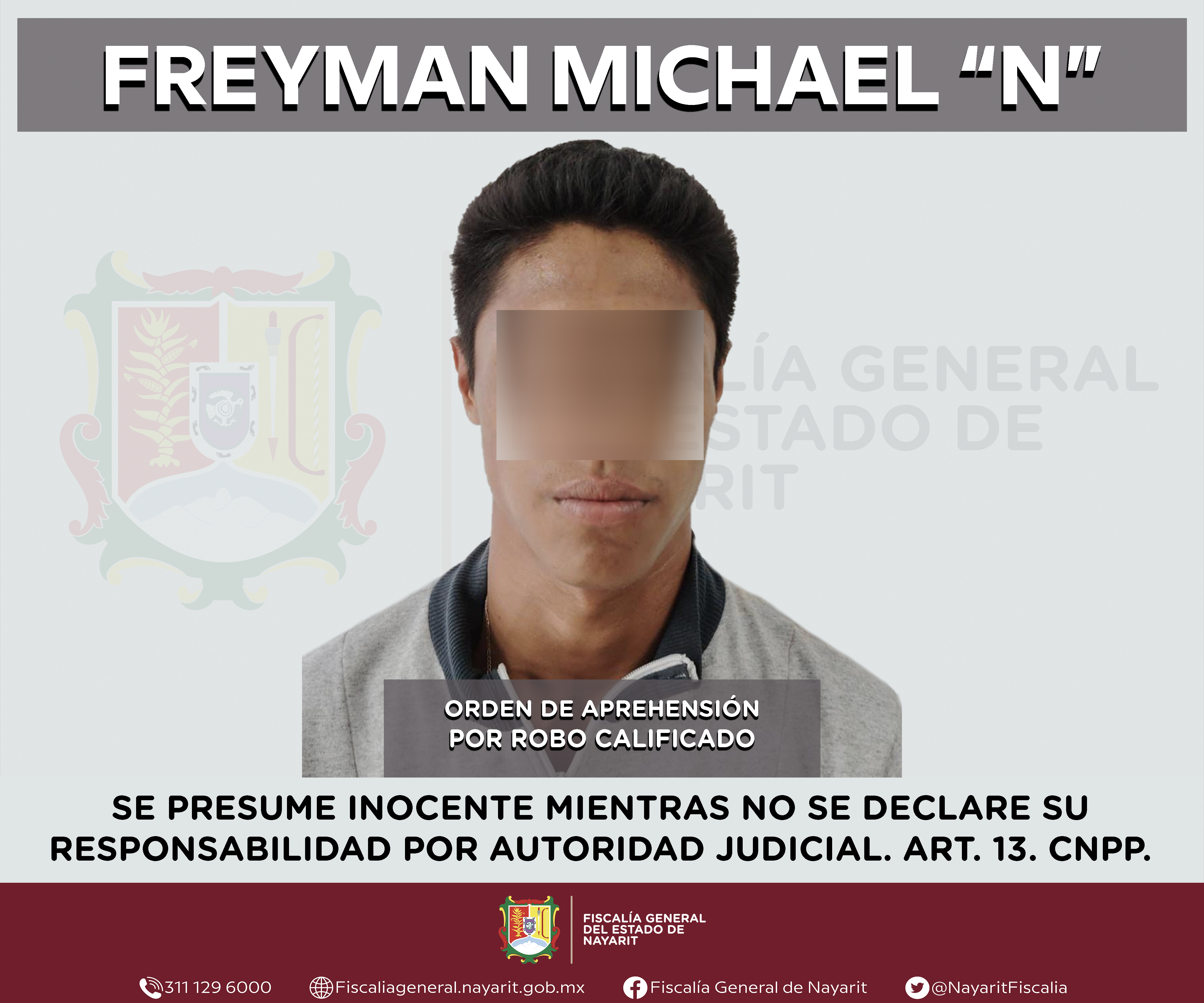 La Fiscalía General del Estado a través de la Agencia de Investigación Criminal cumplimentó una orden de aprehensión en la capital nayarita contra Freyman Michael “N”, por su presunta participación en hechos que según apreciación de la ley co...