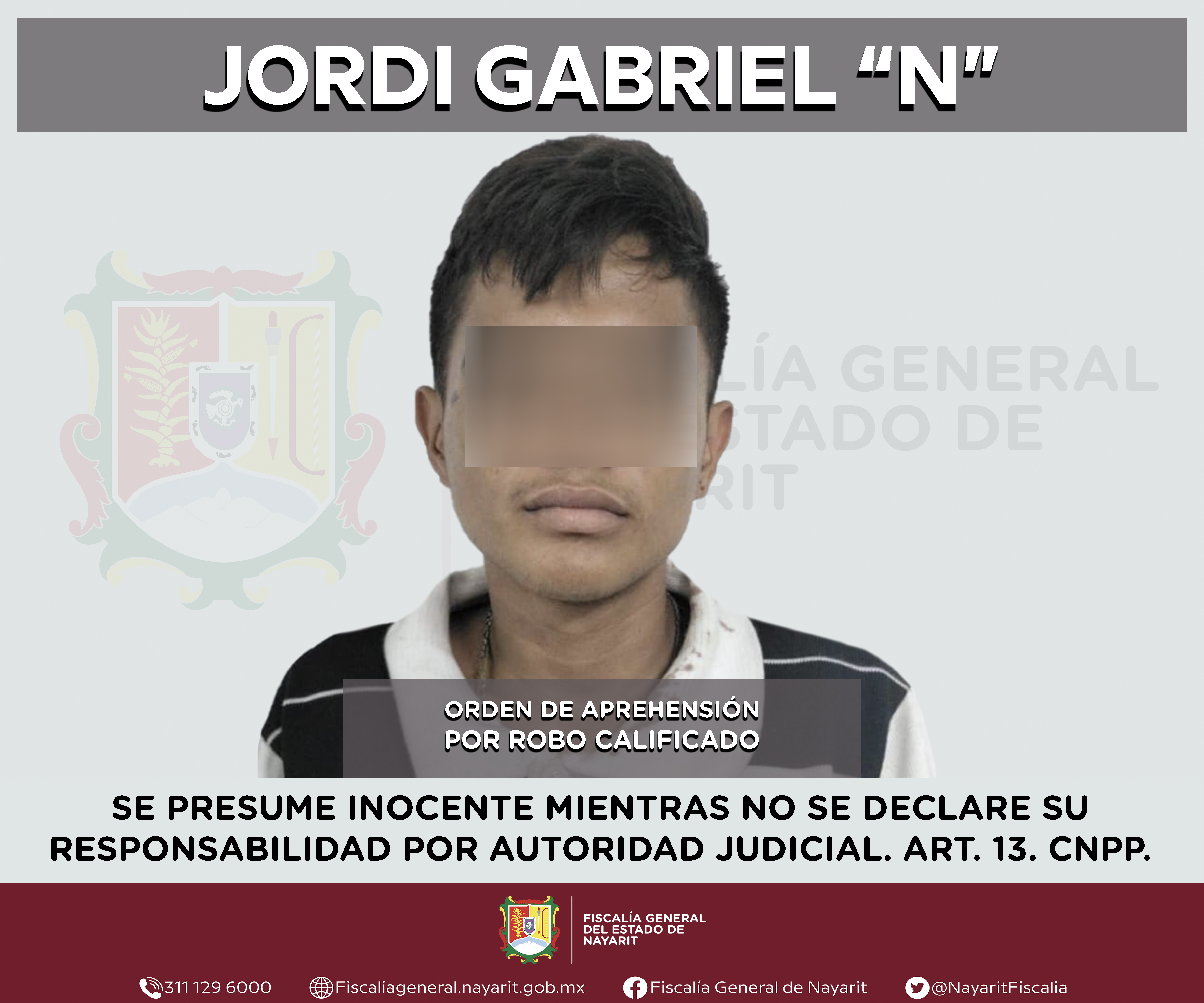 Elementos de la Agencia de Investigación Criminal de Nayarit ejecutaron una orden de aprehensión en la capital nayarita contra Jordi Gabriel “N”, por su probable responsabilidad en hechos que bajo apreciación de la ley configuran el delito de robo...