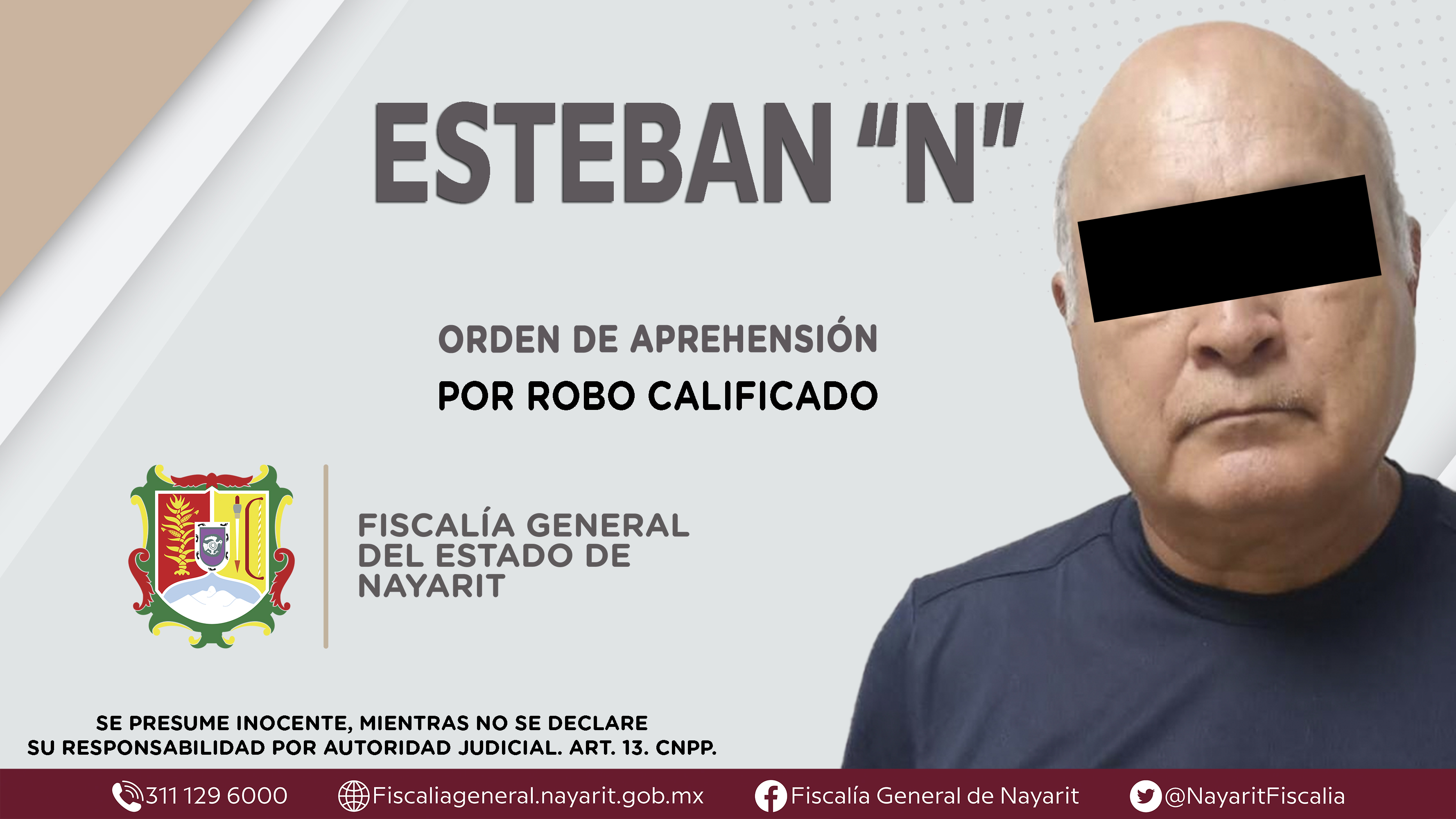Elementos de la Agencia de Investigación Criminal de Nayarit ejecutaron una orden de aprehensión en la capital nayarita contra Esteban “N”, por su presunta participación en hechos que según apreciación de la ley encuadran el delito de robo calif...