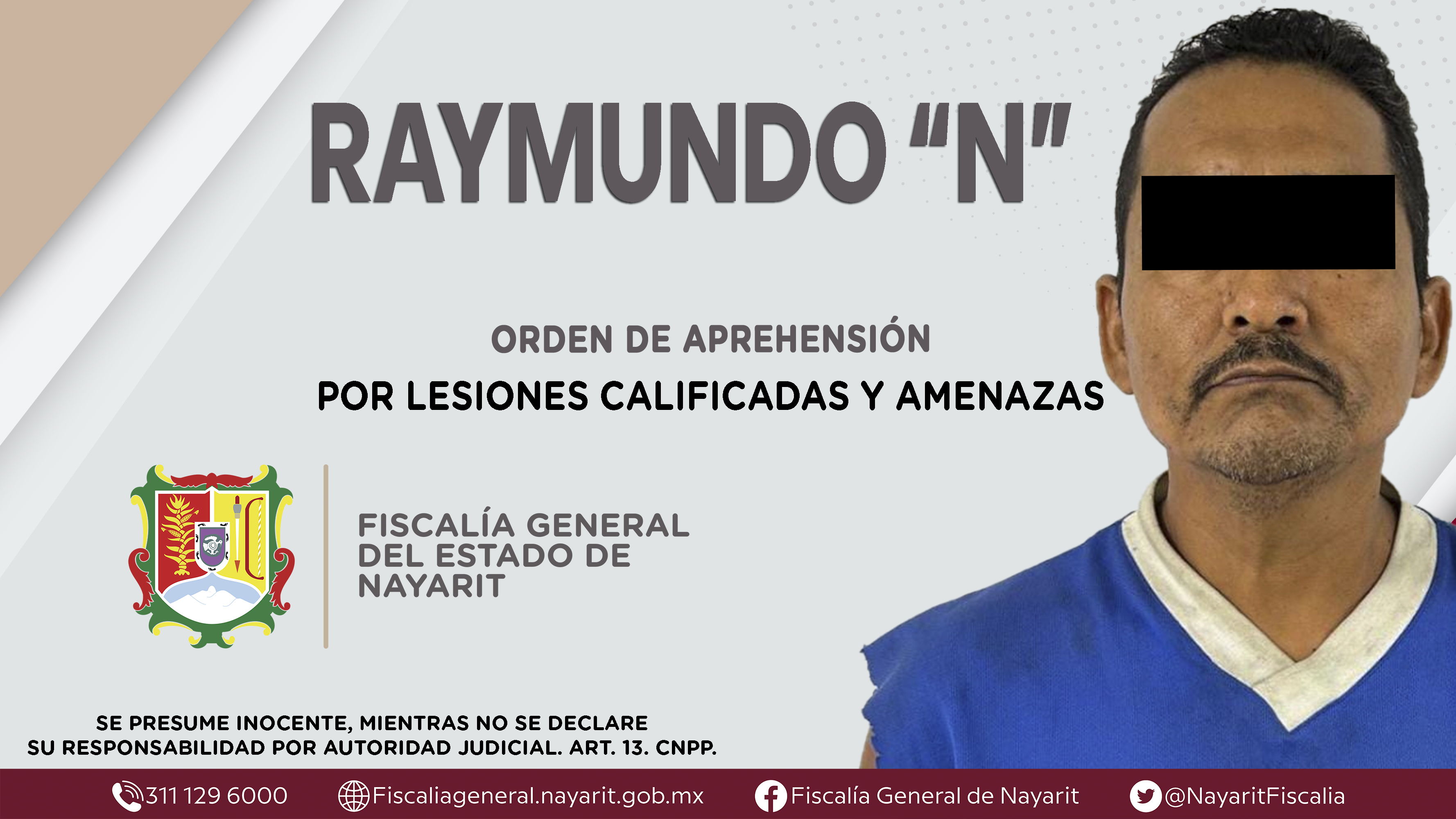 Elementos de la Agencia de Investigación Criminal de Nayarit ejecutaron una orden de aprehensión en la capital nayarita contra Raymundo “N”, por su presunta participación en hechos que según apreciación de la ley encuadran los delitos de lesione...