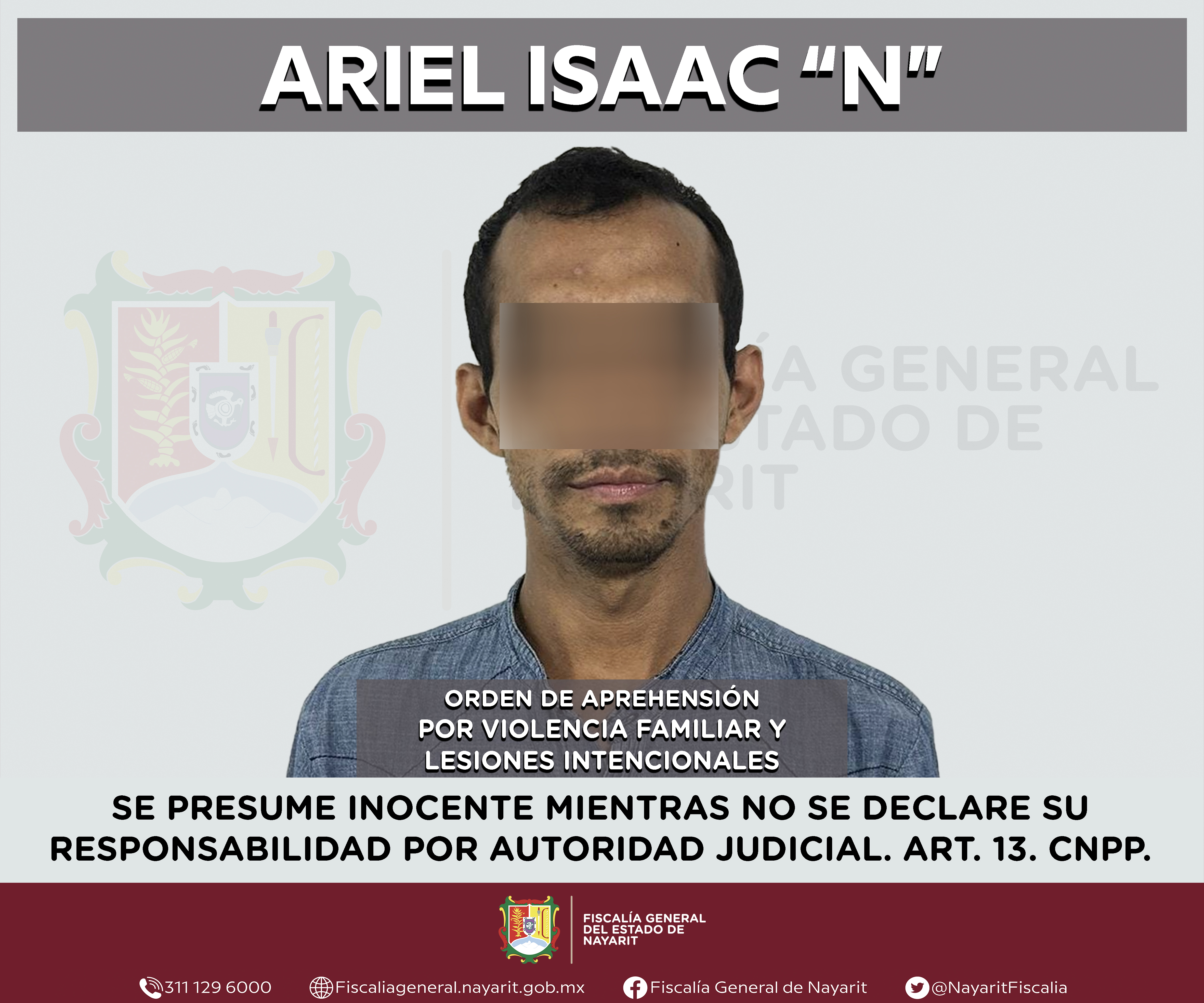 La Fiscalía General del estado de Nayarit a través de la Agencia de Investigación Criminal ejecutó una orden de aprehensión en la ciudad de Tepic contra Ariel Isaac “N”, por su probable participación en hechos que para la ley constituyen los de...