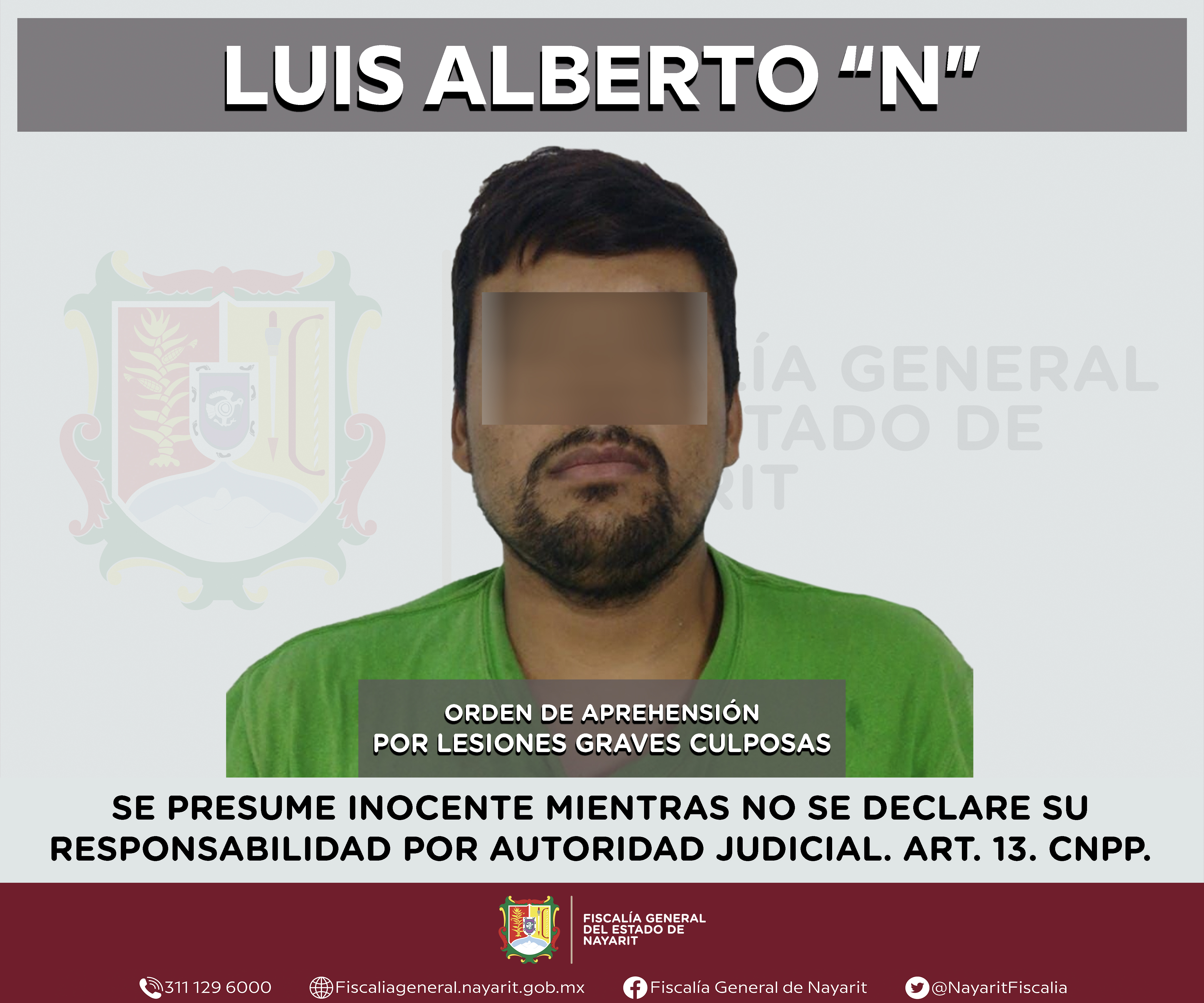 Elementos de la Agencia de Investigación Criminal de Nayarit ejecutaron una orden de aprehensión en la capital nayarita contra Luis Alberto “N”, por su presunta participación en hechos que según apreciación de la ley encuadran el delito de lesio...