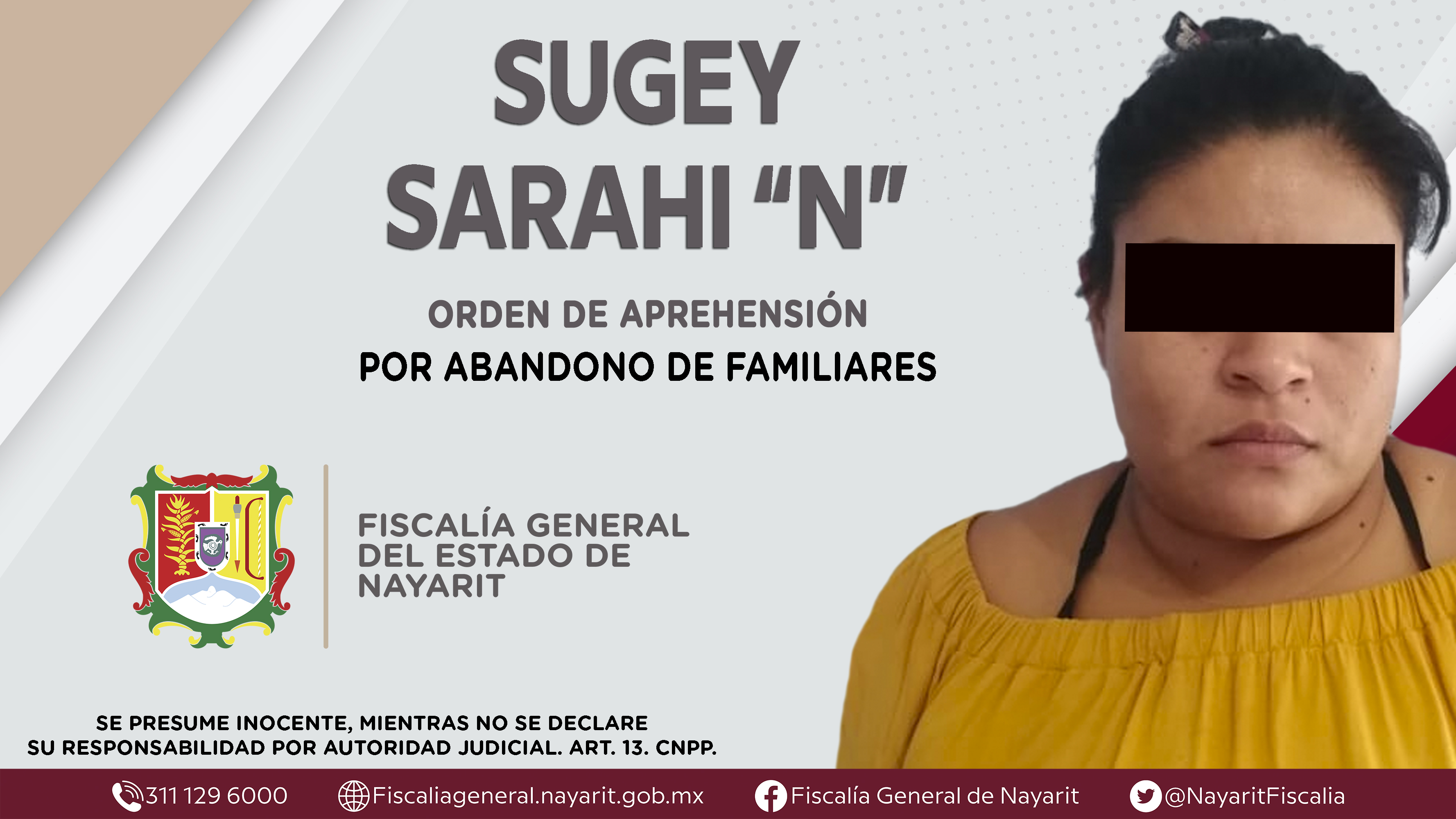 En el poblado El Malinal, municipio de Xalisco, la Fiscalía General de Nayarit a través de la Agencia de Investigación Criminal ejecutó una orden de aprehensión contra Sugey Sarahi “N”, por su probable participación en hechos que la ley calific...