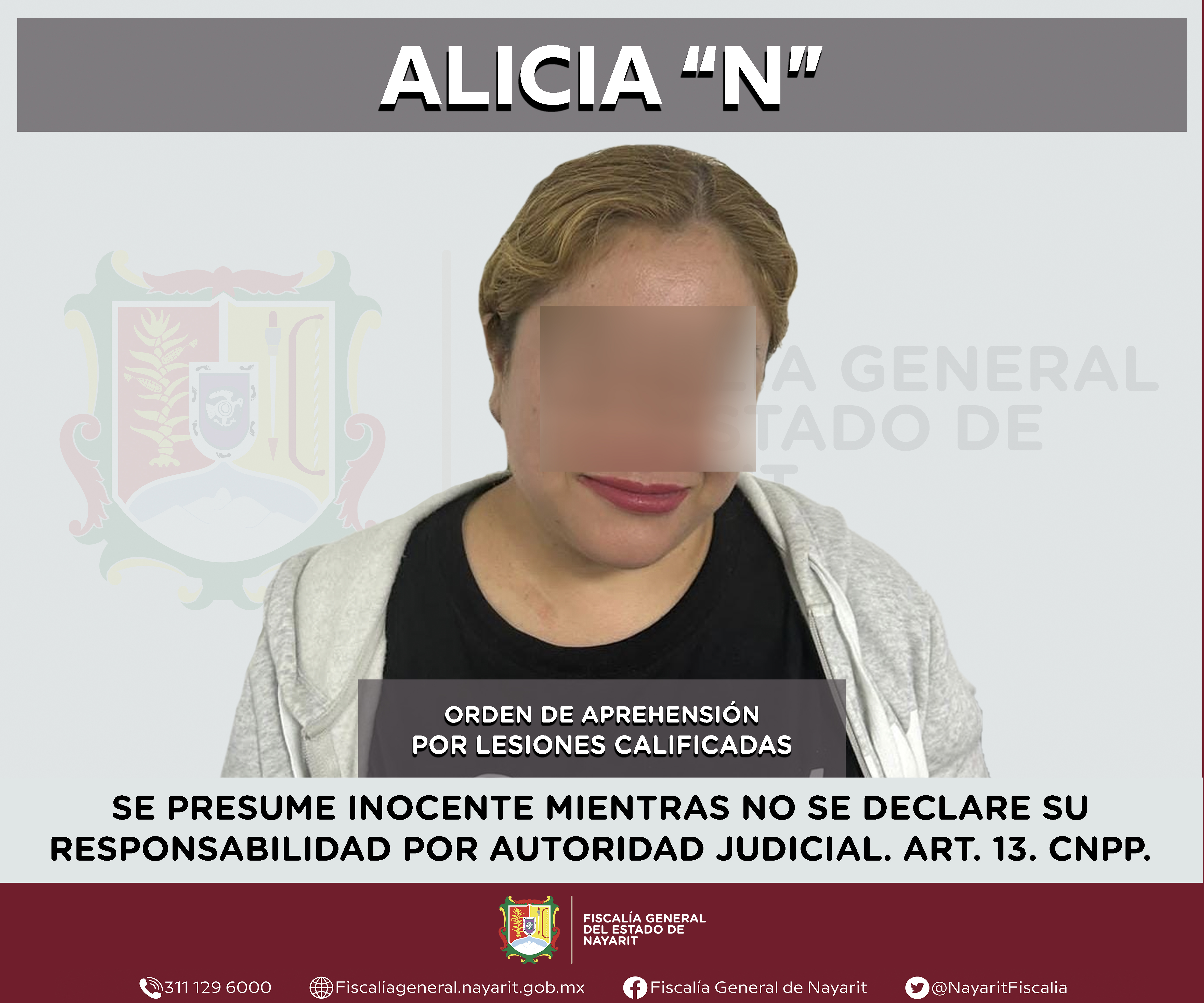 Elementos de la Agencia de Investigación Criminal de Nayarit ejecutaron una orden de aprehensión en la capital nayarita contra Alicia “N”, por su presunta participación en hechos que según apreciación de la ley encuadran el delito de lesiones ca...
