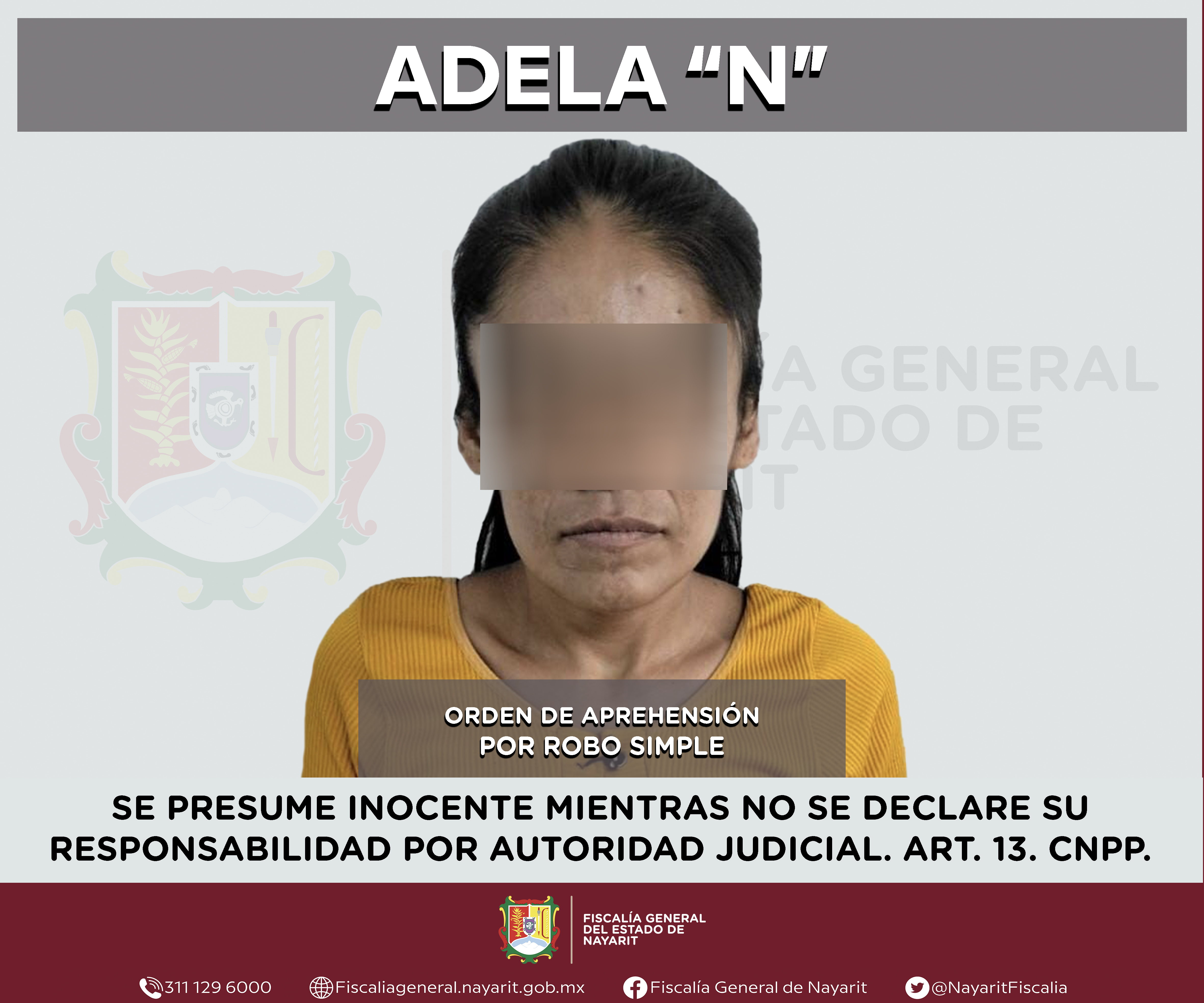 Elementos de la Agencia de Investigación Criminal de Nayarit ejecutaron una orden de aprehensión en la ciudad de Tepic contra Adela “N”, por su presunta participación en hechos que según valoración de la ley encuadran el delito de robo simple, c...
