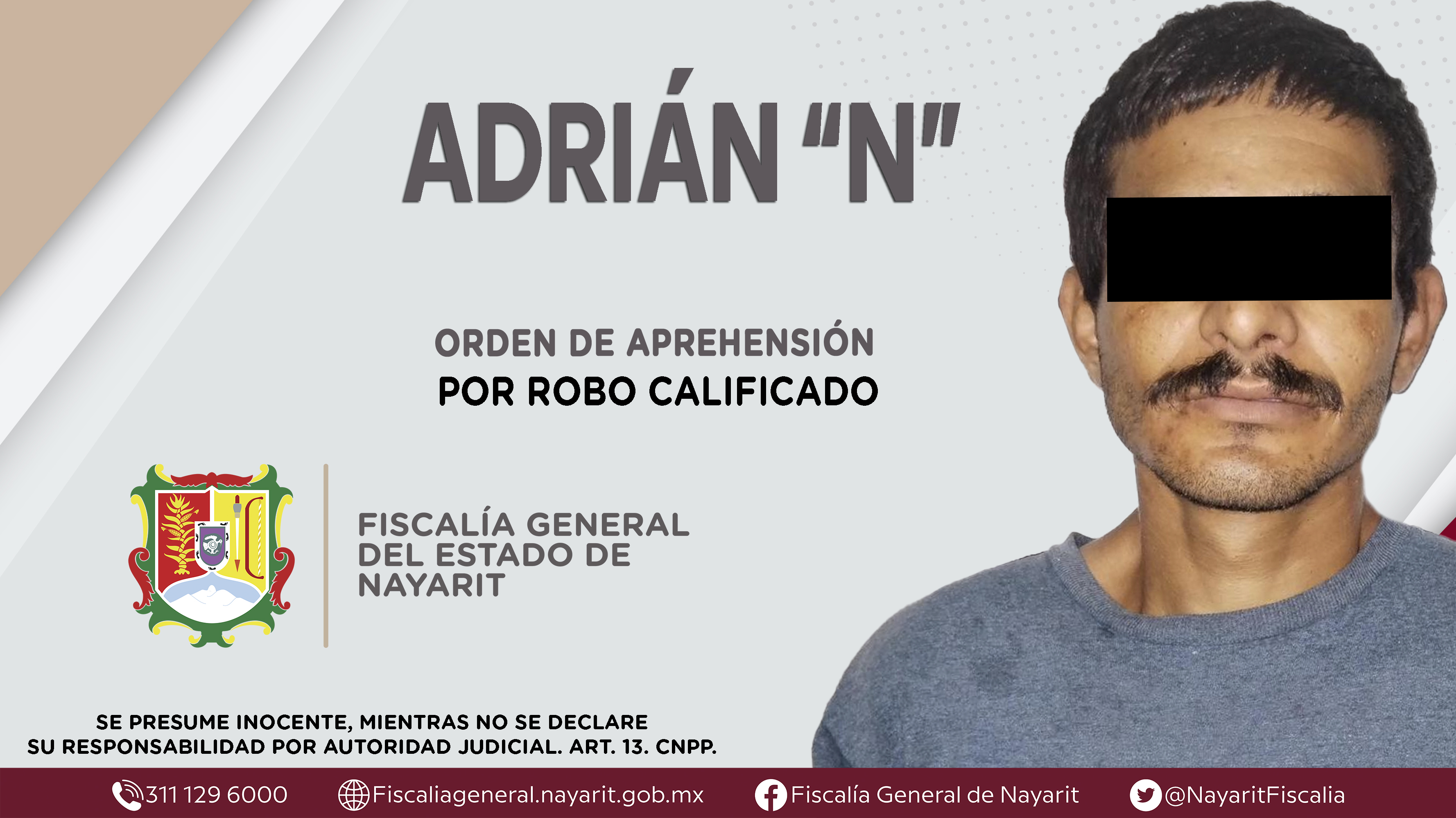 Elementos de la Agencia de Investigación Criminal de Nayarit ejecutaron una orden de aprehensión en la capital nayarita contra Adrián “N”, por su presunta participación en hechos que según apreciación de la ley encuadran el delito robo califica...