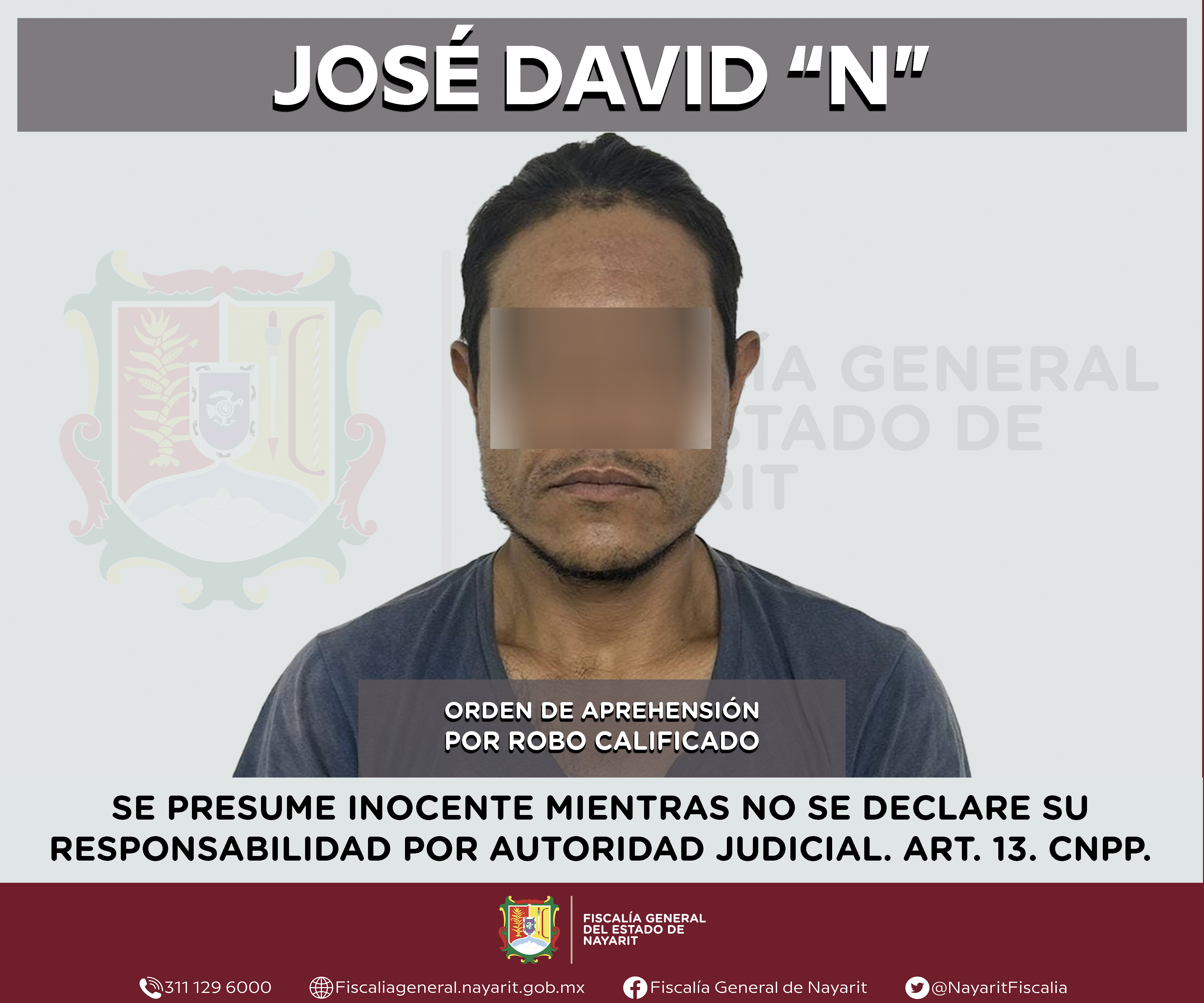 Elementos de la Agencia de Investigación Criminal de Nayarit ejecutaron una orden de aprehensión en la capital nayarita contra José David “N”, por su presunta participación en hechos que según apreciación de la ley encuadran el delito de robo c...