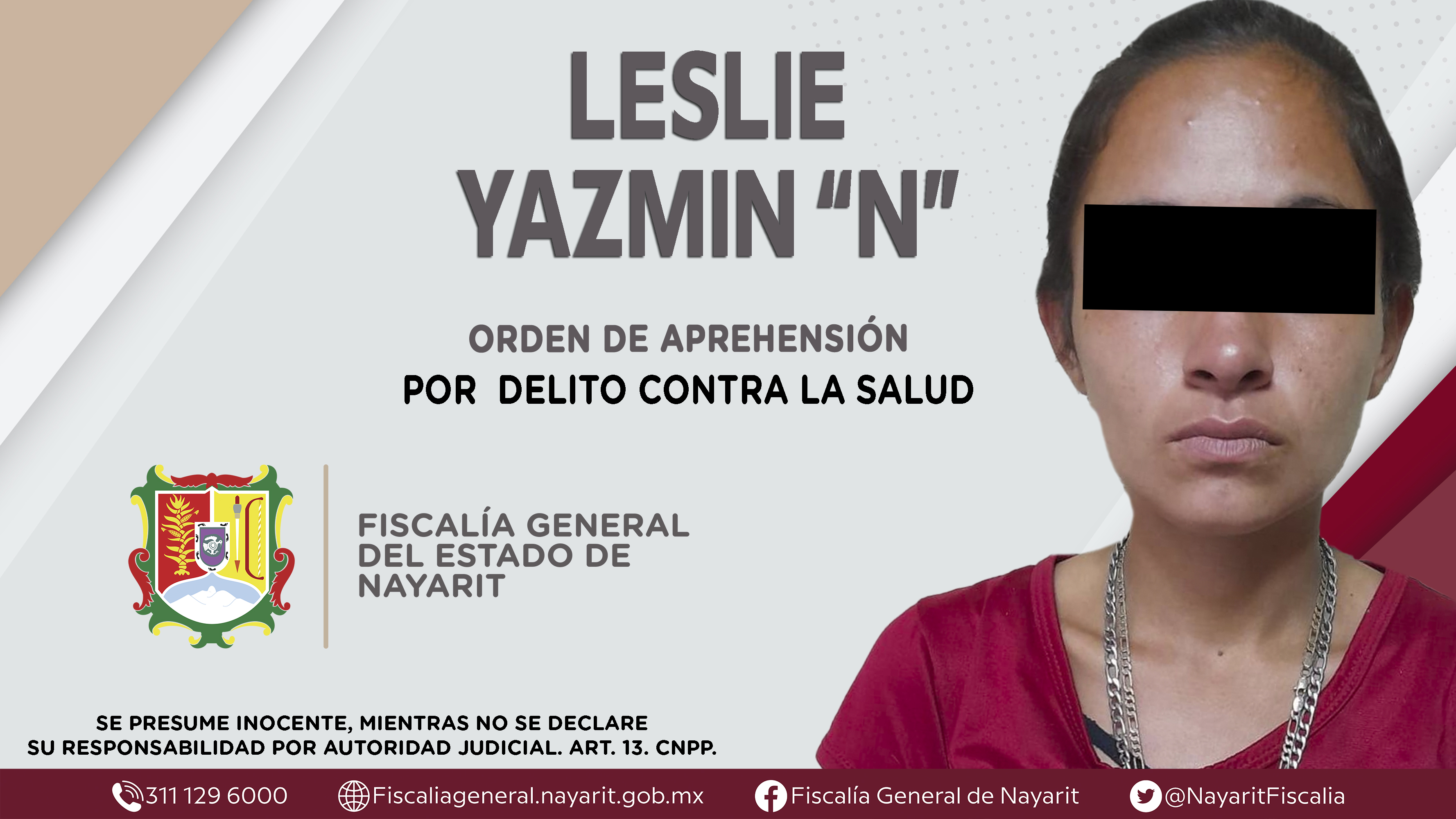 En la ciudad de Tepic, la Fiscalía General de Nayarit a través de la Agencia de Investigación Criminal ejecutó una orden de aprehensión contra Leslie Yazmin “N”, originaria y vecina de la capital nayarita, por su presuntiva responsabilidad penal...
