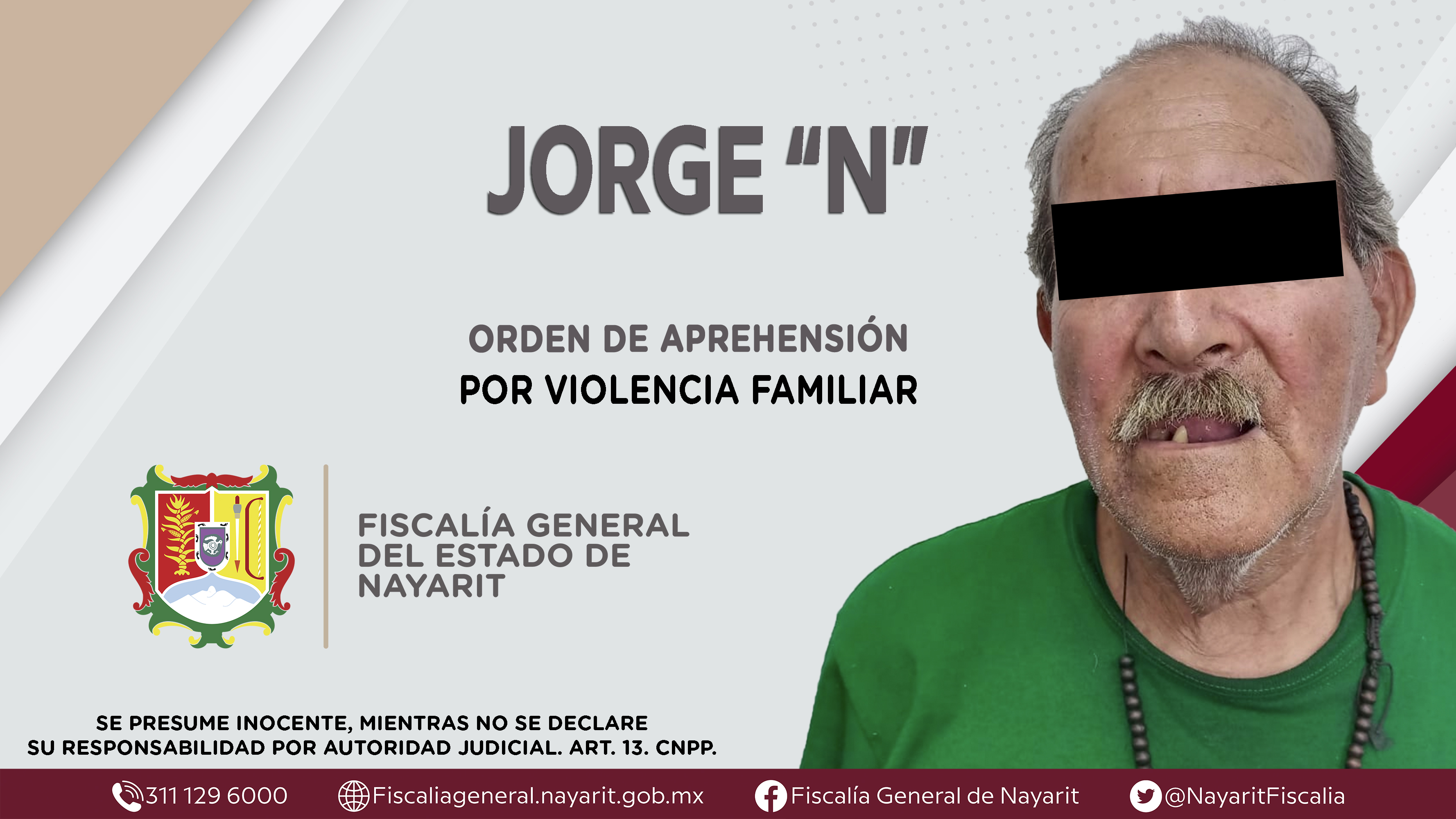 Elementos de la Agencia de Investigación Criminal ejecutaron una orden de aprehensión en la capital nayarita contra Jorge “N”, originario y vecino de la ciudad de Tepic, por su presuntiva responsabilidad penal en hechos que la ley califica como del...