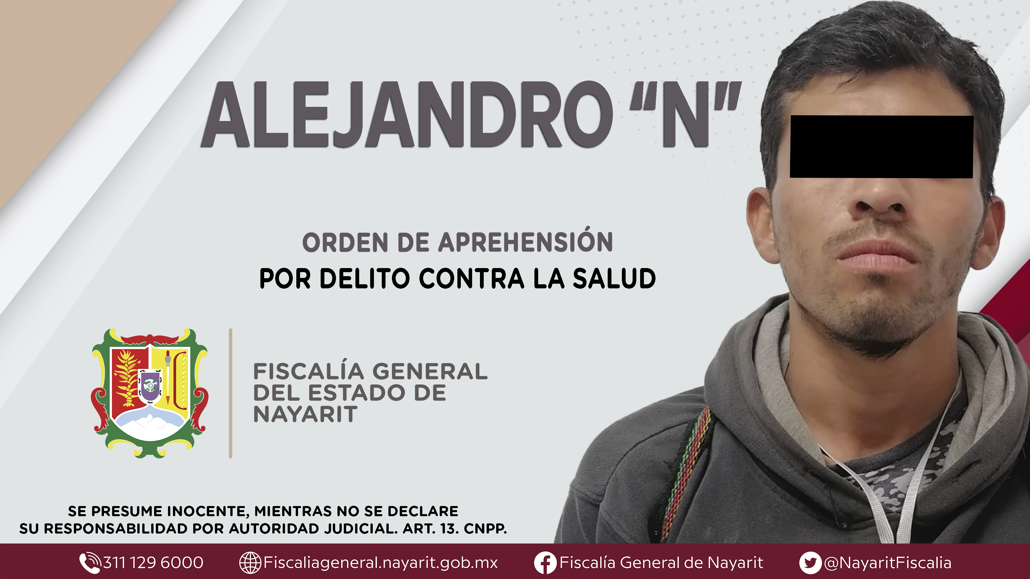 La Fiscalía General de Nayarit a través del Centro de Operaciones Estratégicas (C.O.E.) ejecutó una orden de aprehensión en la ciudad de Tepic contra Alejandro “N”, originario de Zapopan, Jalisco, por su presunta participación en hechos que seg...