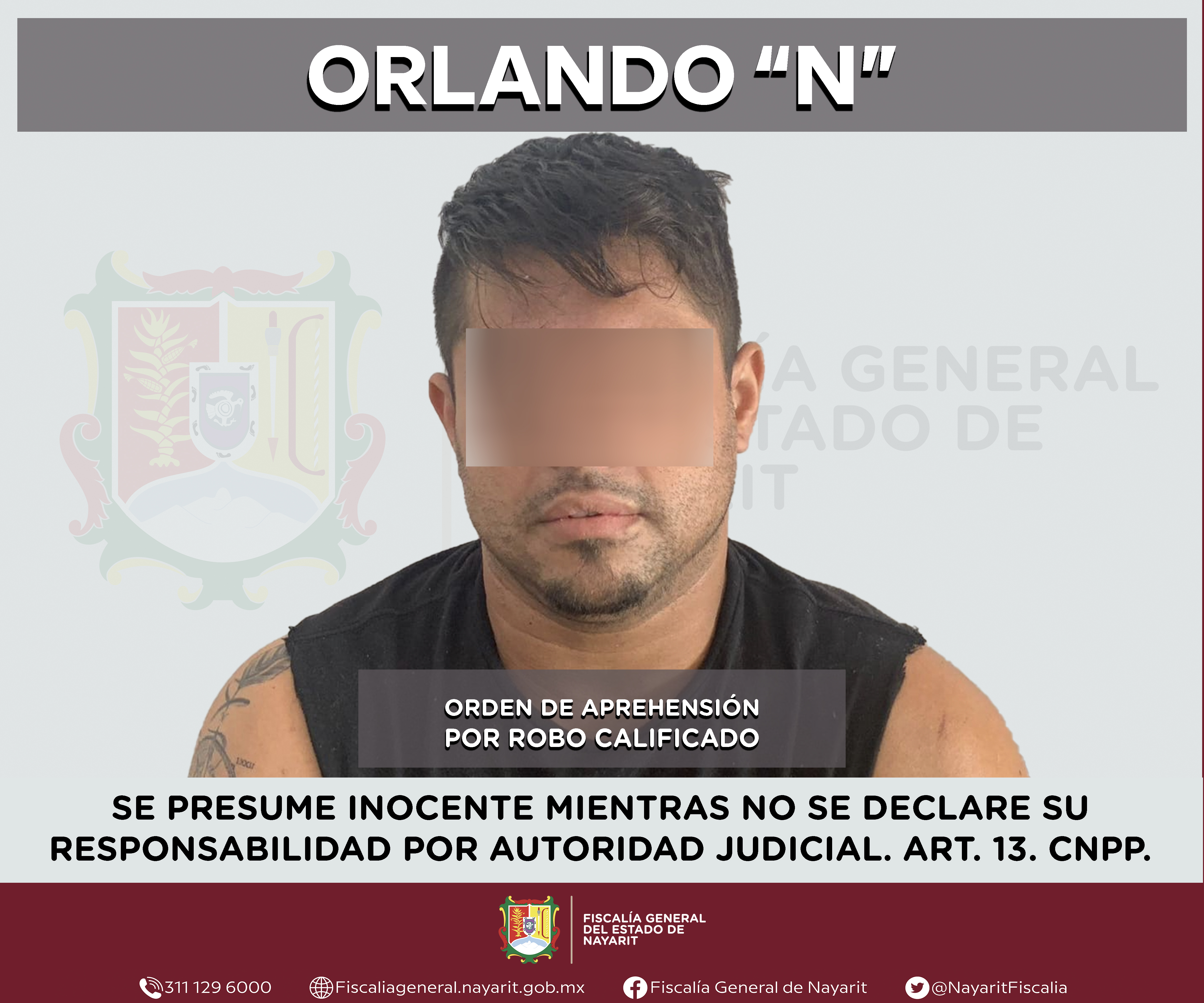 Elementos de la Agencia de Investigación Criminal de Nayarit ejecutaron una orden de aprehensión en la capital nayarita contra Orlando “N”, por su presunta participación en hechos que según apreciación de la ley encuadran el delito de robo calif...
