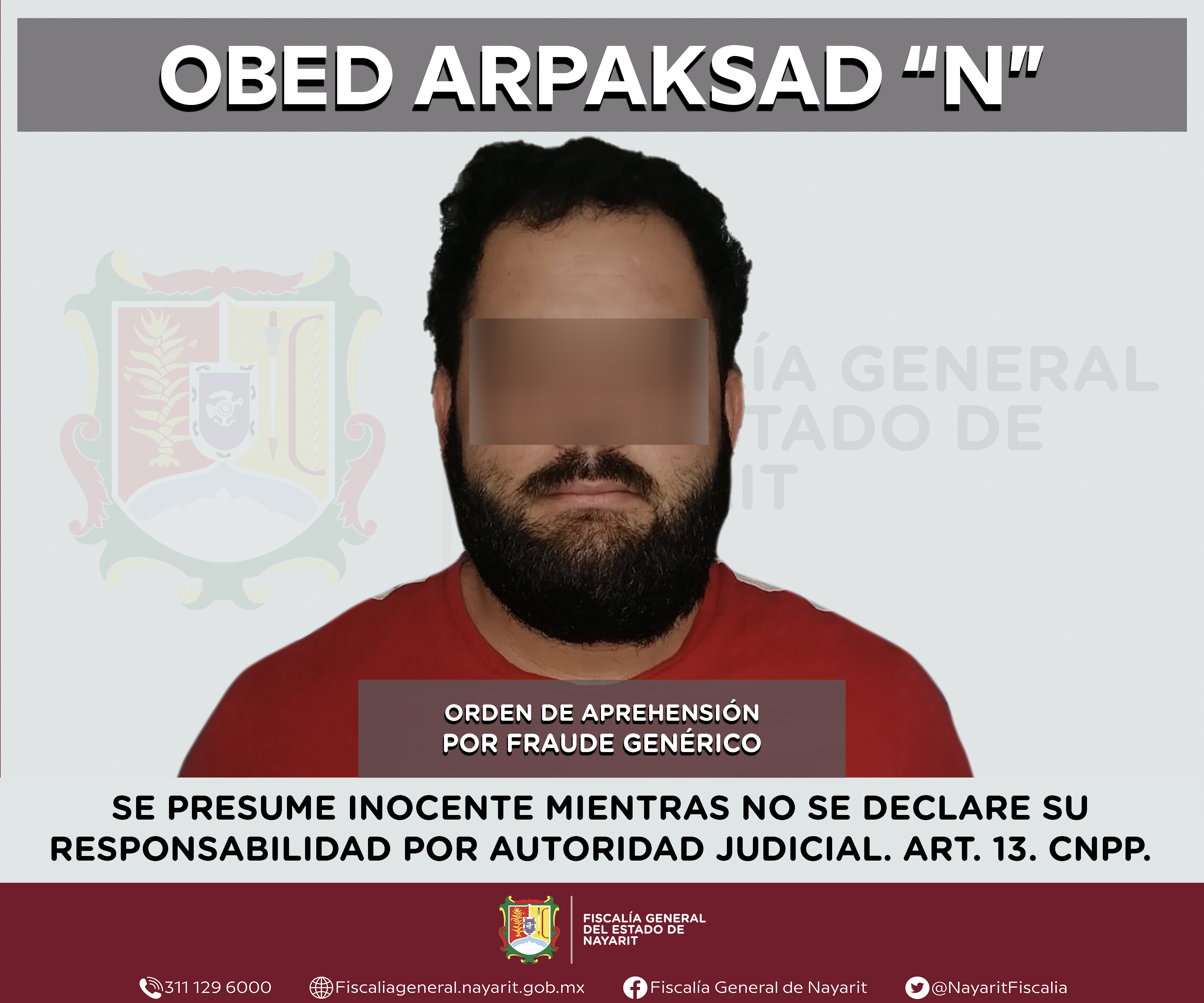 La Fiscalía General del estado de Nayarit a través de la Agencia de Investigación Criminal ejecutó una orden de aprehensión en la localidad Valle de Banderas, municipio de Bahía de Banderas contra Obed Arpaksad “N”, por su presunta participaci...