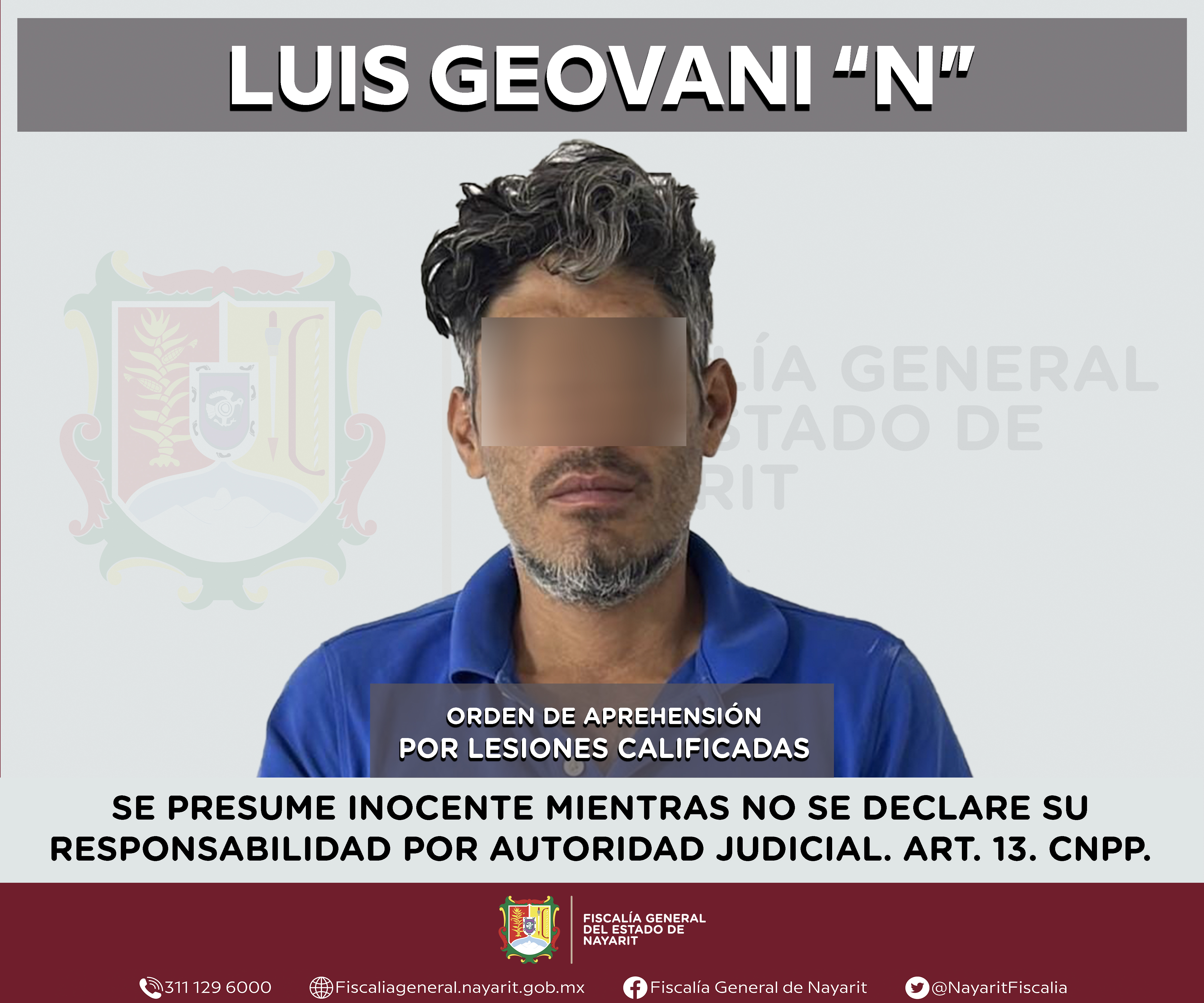 Elementos de la Agencia de Investigación Criminal de Nayarit ejecutaron una orden de aprehensión en la capital nayarita contra Luis Geovani “N”, por su presunta participación en hechos que según apreciación de la ley encuadran el delito de lesio...