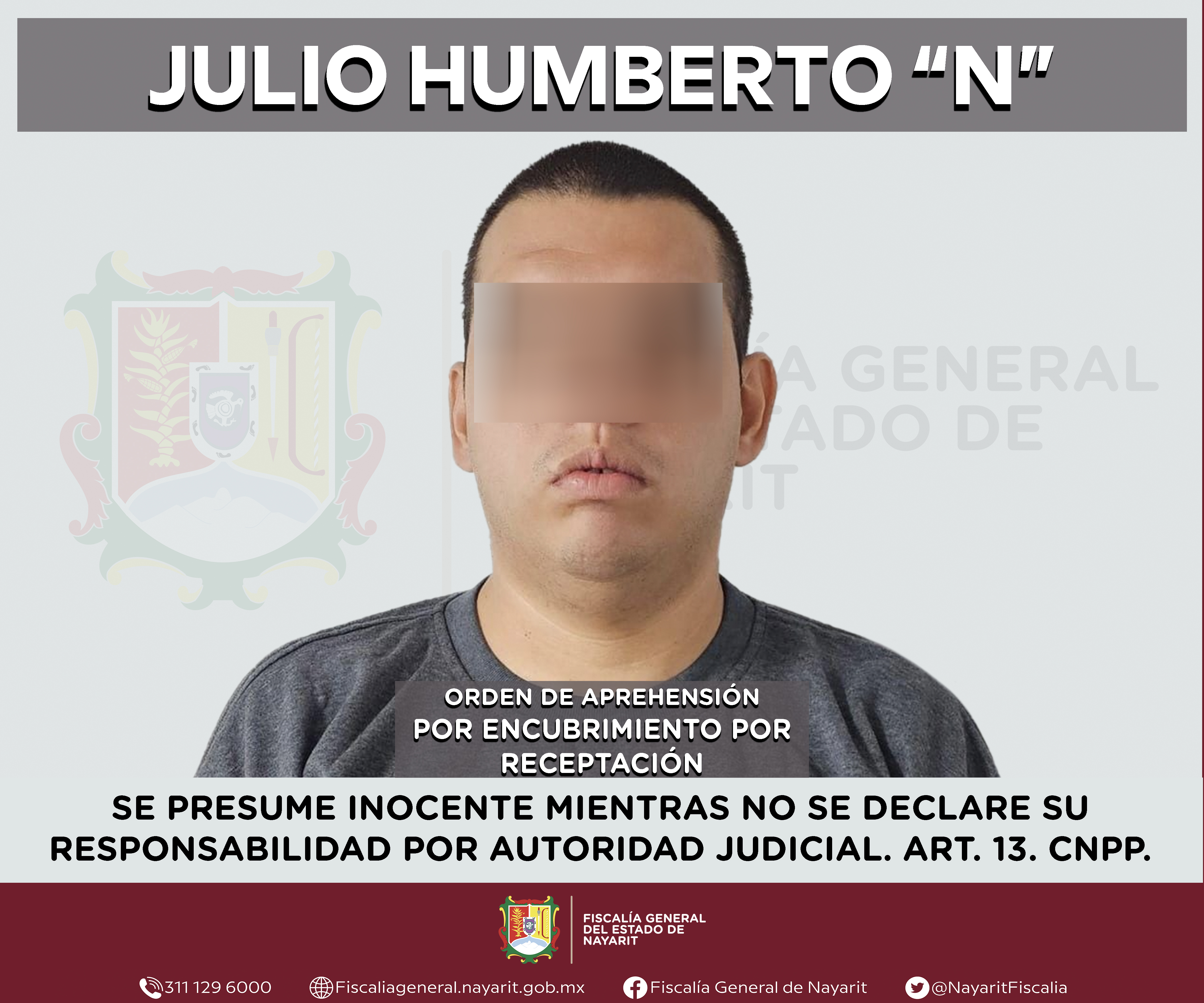Elementos de la Agencia de Investigación Criminal de Nayarit ejecutaron una orden de aprehensión en la ciudad de Tepic contra Julio Humberto “N”, por su probable participación en hechos que para la ley configuran el delito de encubrimiento por rec...