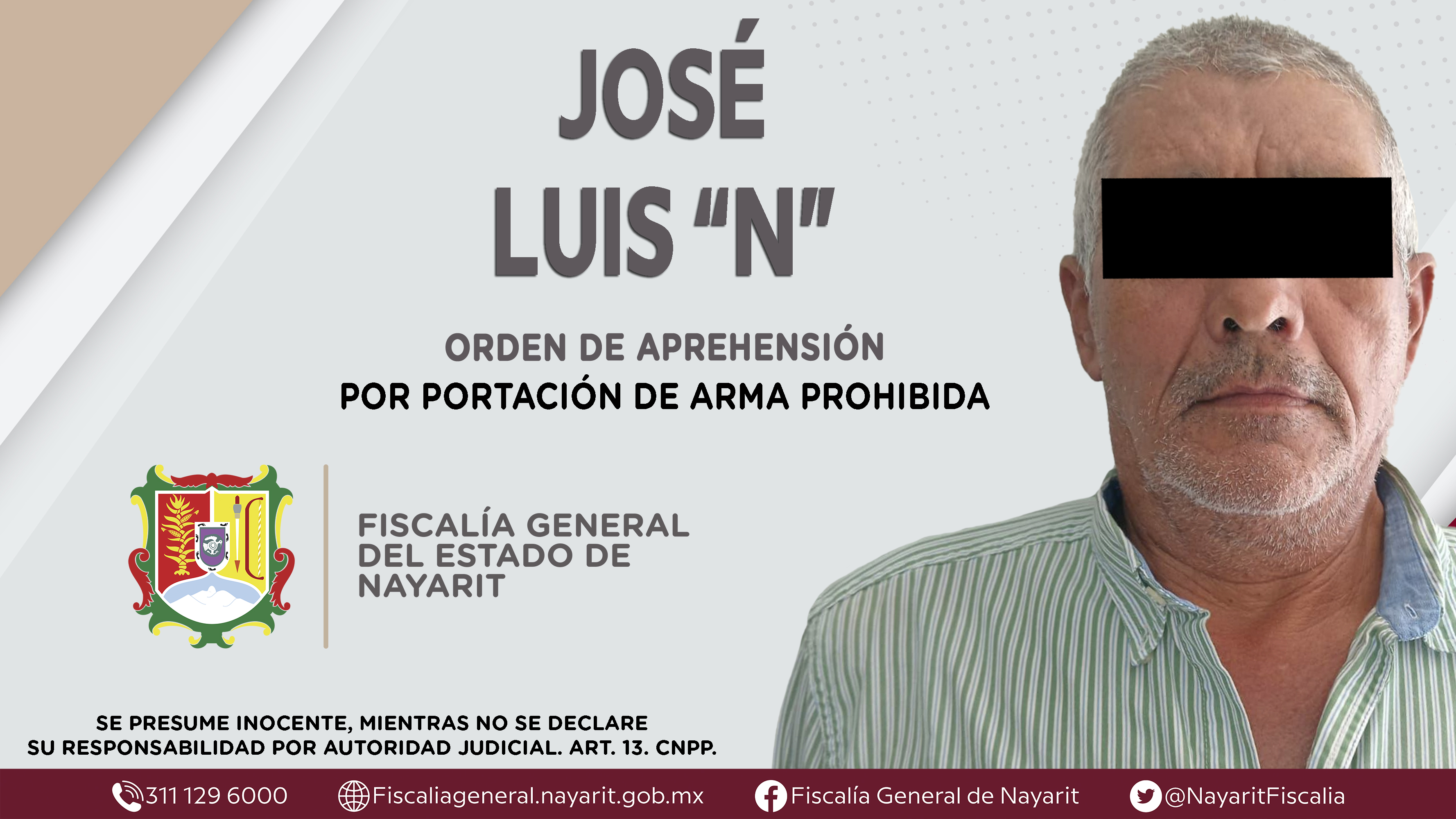Elementos de la Agencia de Investigación Criminal de Nayarit ejecutaron una orden de aprehensión en la ciudad de Tepic contra José Luis “N”, por su presunta participación en hechos que según apreciación de la ley configuran el delito de portaci...
