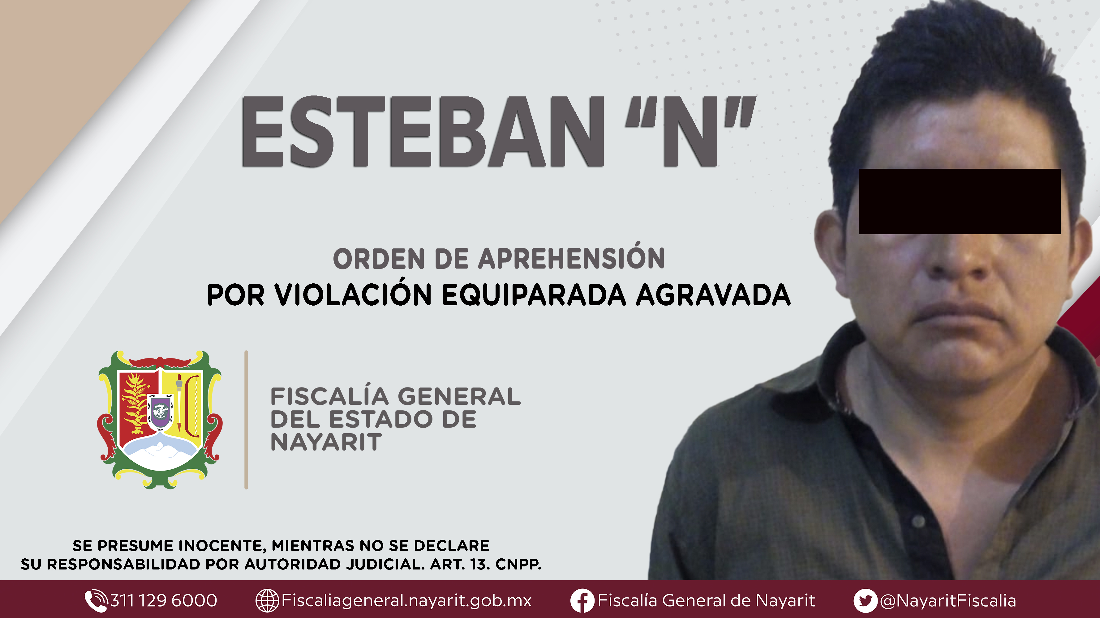 La Fiscalía General del Estado a través de la Agencia de Investigación Criminal dio cumplimiento a una orden de aprehensión en el municipio de Tuxpan contra Esteban “N”, quien es originario y vecino del municipio Del Nayar, por su presunta partic...