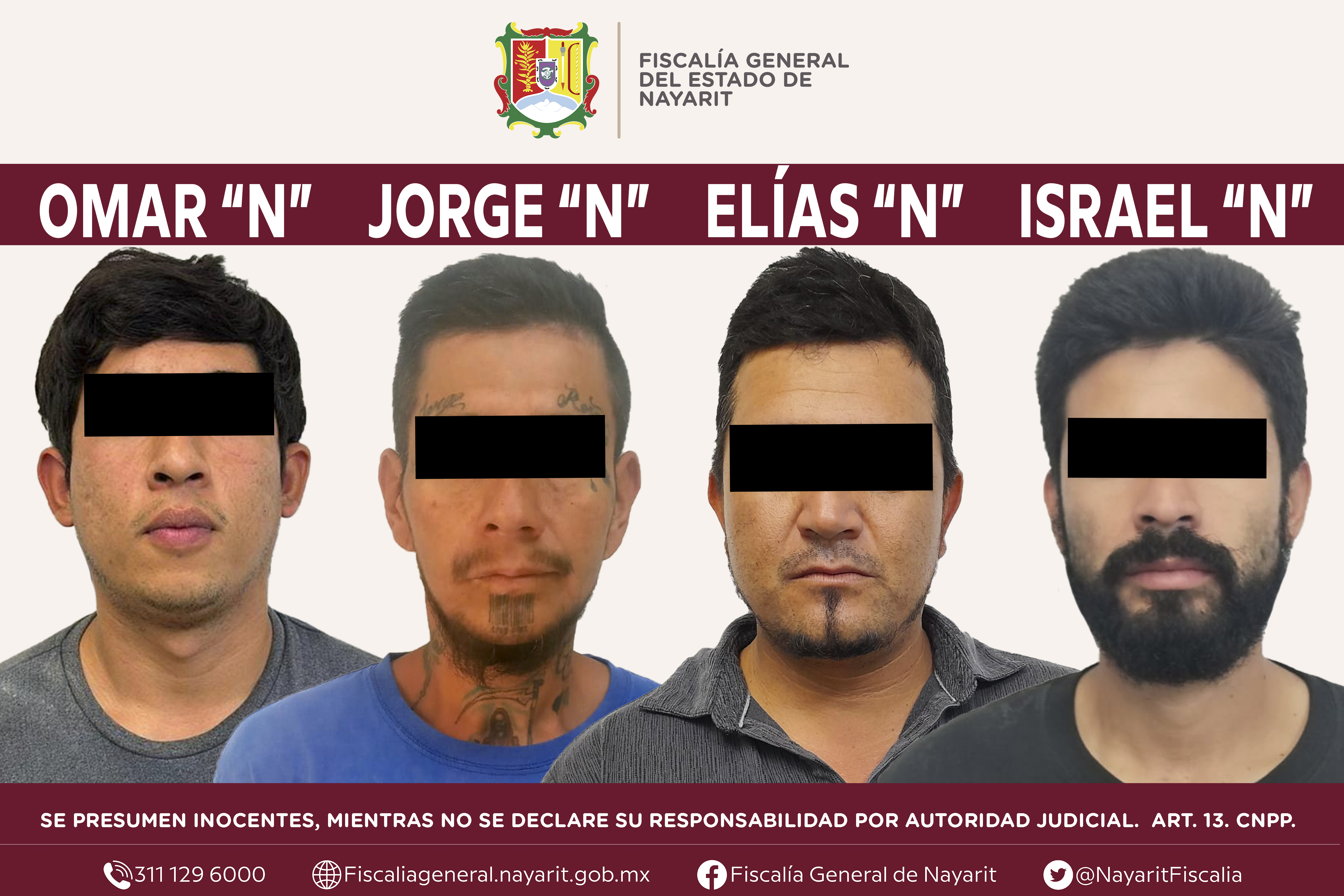 La Fiscalía General de Nayarit a través la Agencia de Investigación Criminal dio cumplimiento a una orden de aprehensión en la ciudad de Tepic contra Omar “N”, Jorge Iván “N”, Elías Avimelec “N” e Israel Salomón “N”, por su presunt...
