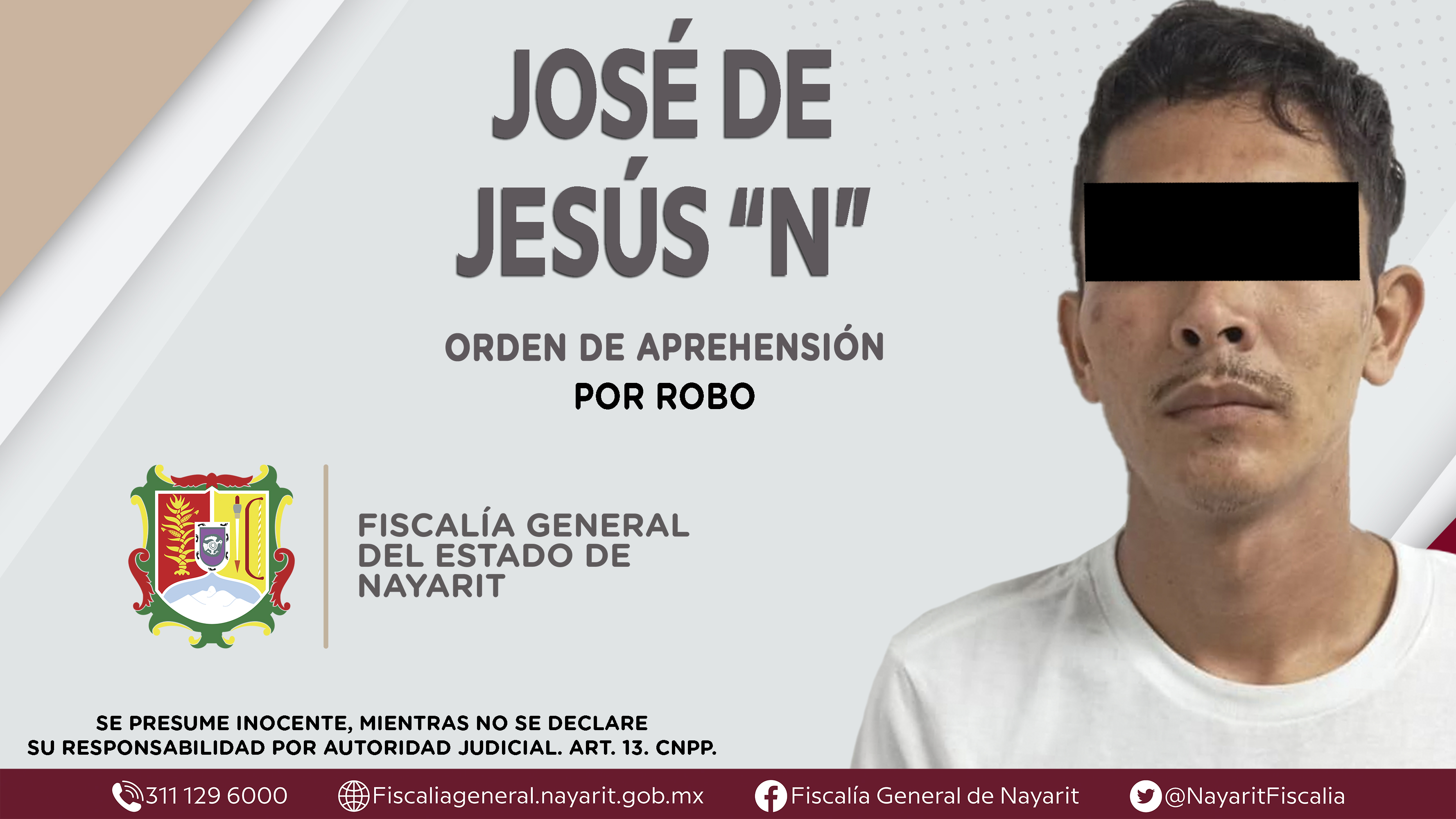 La Fiscalía General del Estado a través de la Agencia de Investigación Criminal dio cumplimiento a una orden de aprehensión en la ciudad de Tepic contra José de Jesús “N”, por su presunta participación en hechos que según apreciación de la l...