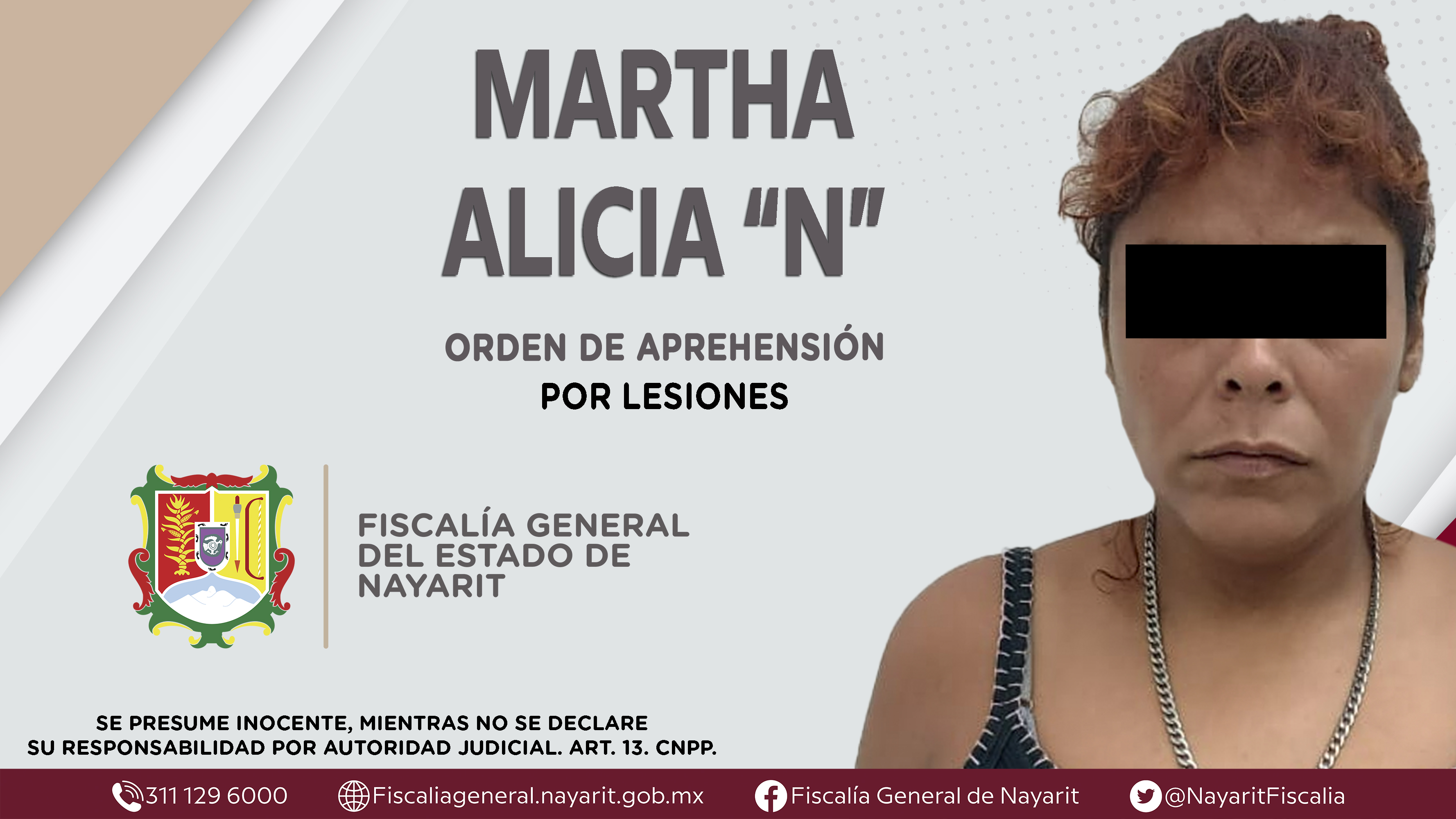 Elementos de la Agencia de Investigación Criminal de Nayarit ejecutaron una orden de aprehensión en la localidad La Peñita de Jaltemba, municipio de Compostela contra Martha Alicia “N”, por su presunta participación en hechos que bajo la apreciac...