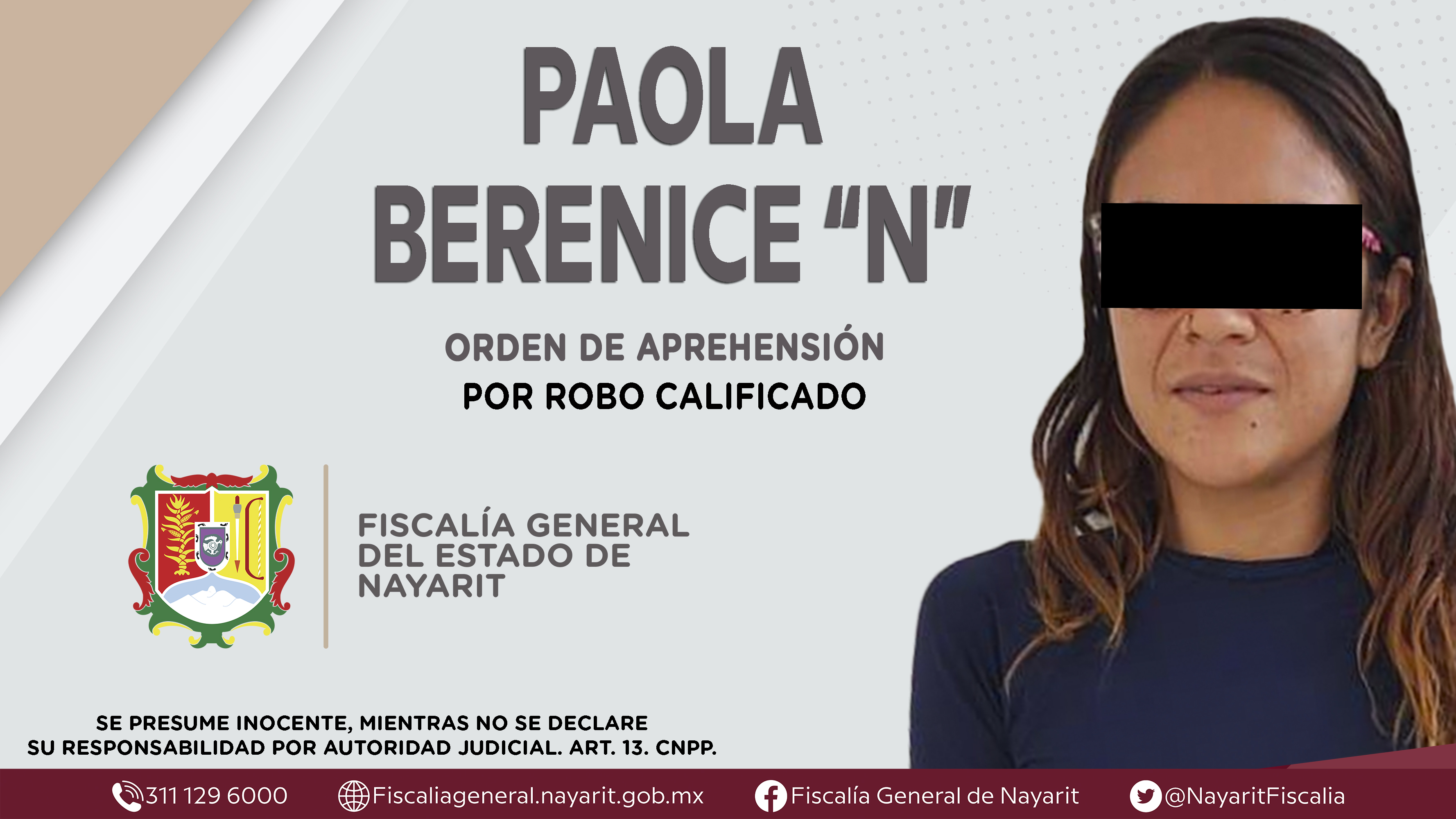 La Fiscalía General de Nayarit a través de la Agencia de Investigación Criminal dio cumplimiento a una orden de aprehensión en el municipio de Bahía de Banderas contra Paola Berenice “N”, por su presunta participación en hechos que según aprec...