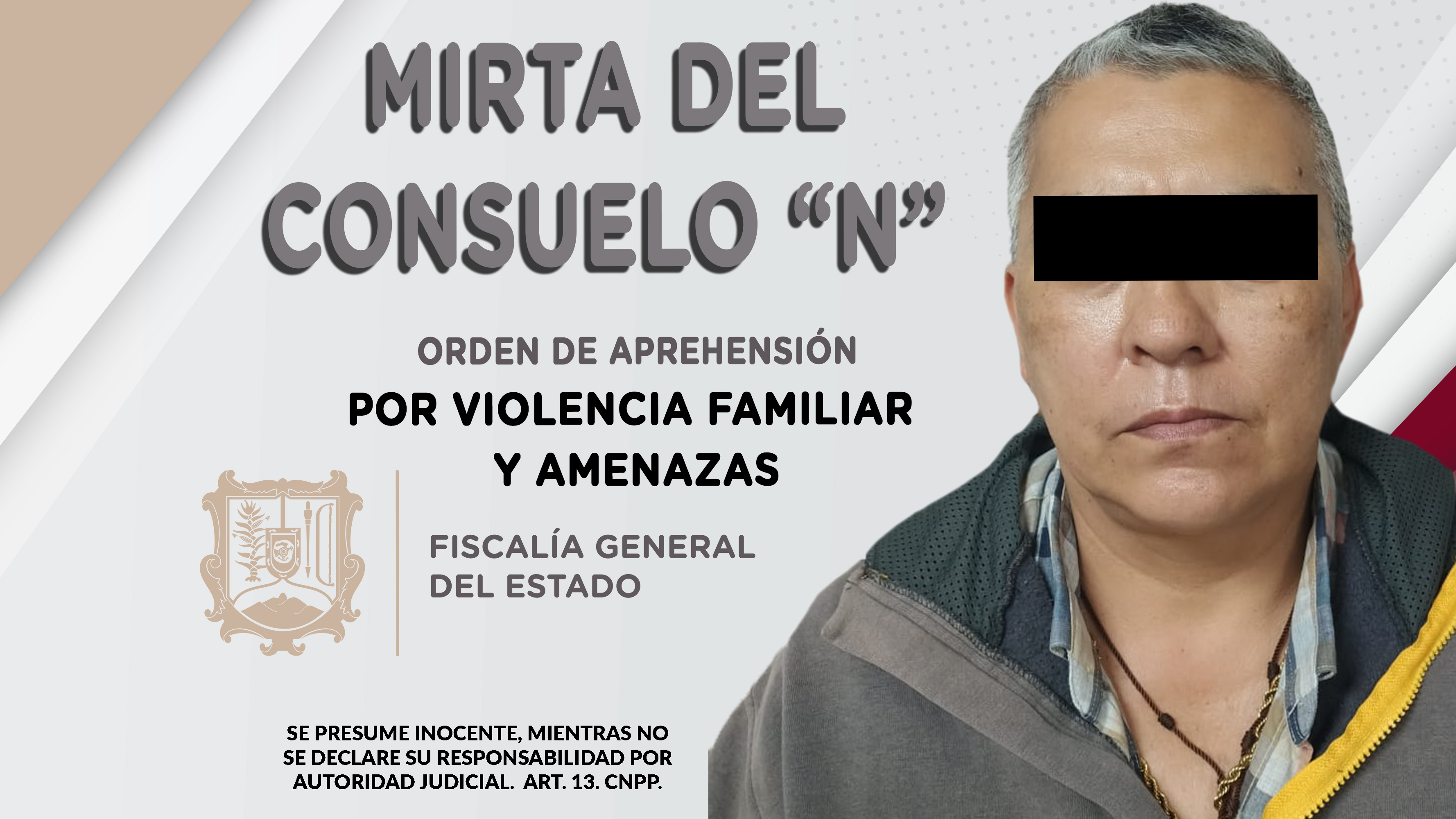 En la ciudad de Tepic, elementos de la Agencia de Investigación Criminal ejecutaron una orden de aprehensión contra Mirta del Consuelo “N”, quien es presunta responsable de hechos que según la ley configuran los delitos de violencia familiares y a...
