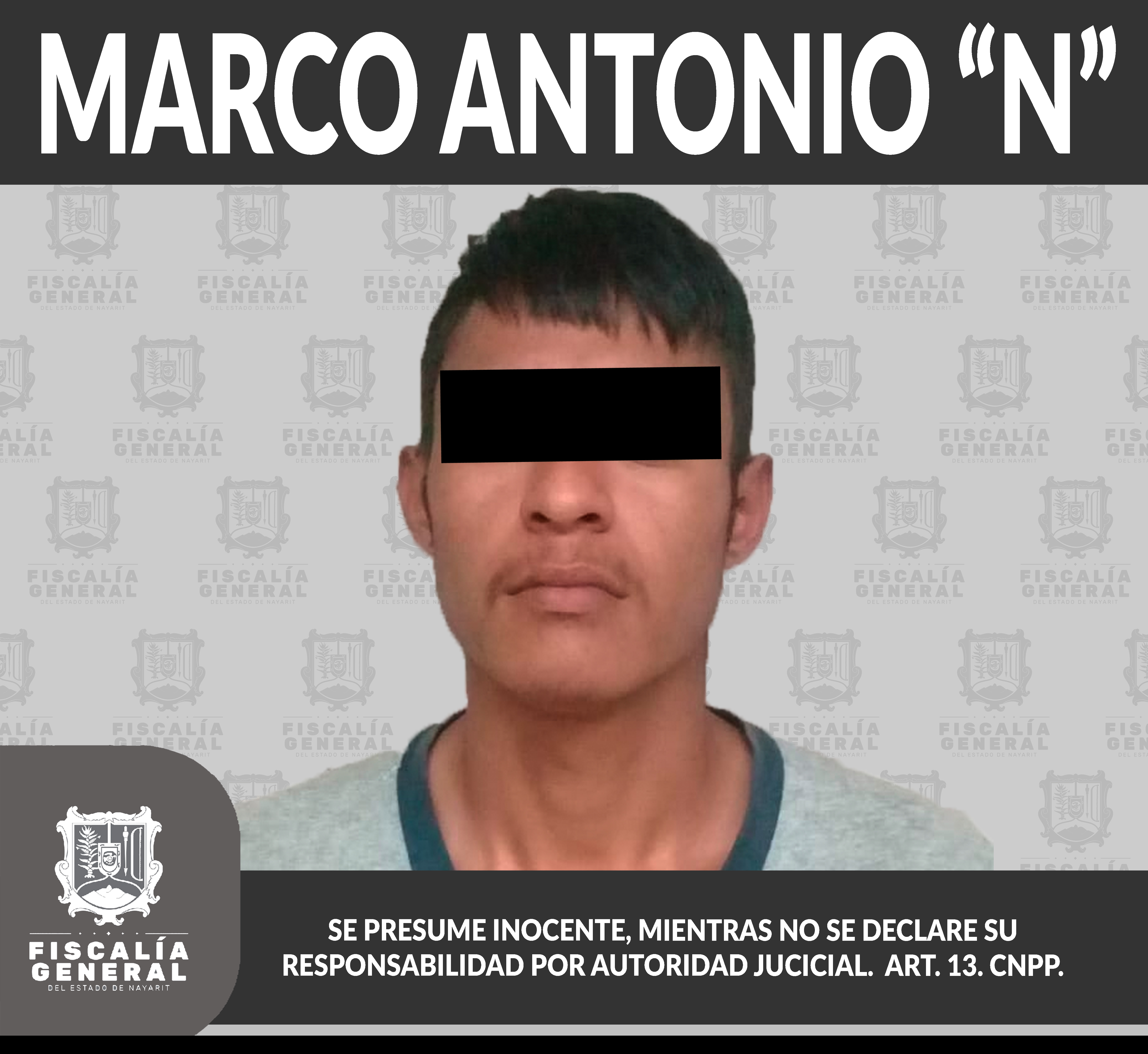 En la ciudad de Tepic fue detenido Marco Antonio “N”, en virtud de haber sido liberada la respectiva orden de aprehensión en su contra, porque presumiblemente es responsable de hechos que la ley señala como delito de robo calificado; ilícito comet...