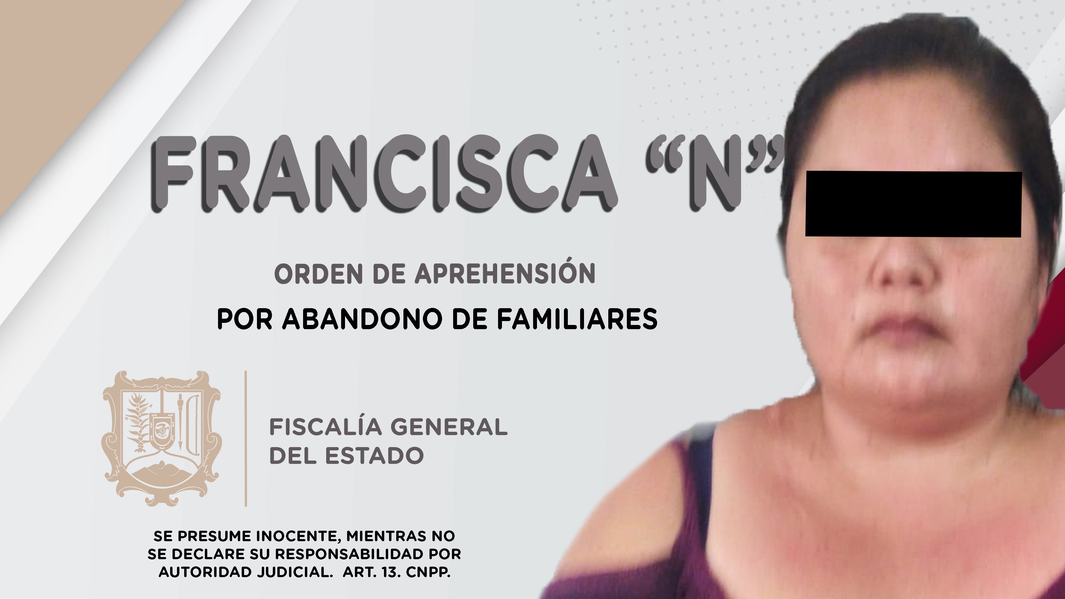 En el municipio de Santiago Ixcuintla, elementos de la Agencia de Investigación Criminal dieron cumplimiento a una orden de aprehensión contra Francisca “N”, por su probable responsabilidad penal en hechos que para la ley constituyen el delito de a...