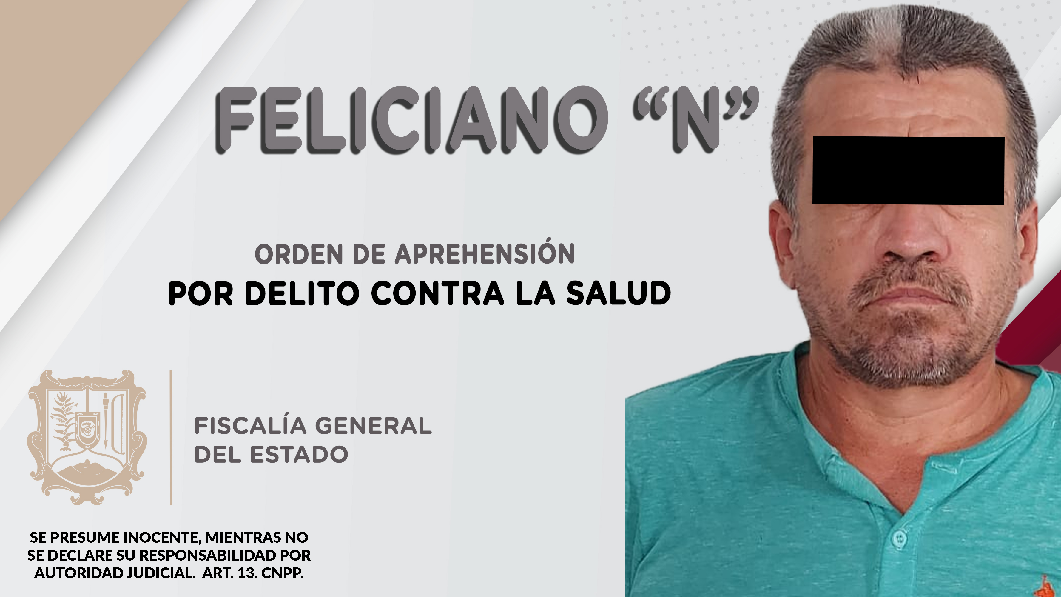 En la ciudad de Tepic, personal de la Agencia de Investigación Criminal ejecutó una orden de aprehensión contra Feliciano “N”, por su probable responsabilidad penal en hechos que para la ley configuran el delito contra la salud, cometido en agravi...