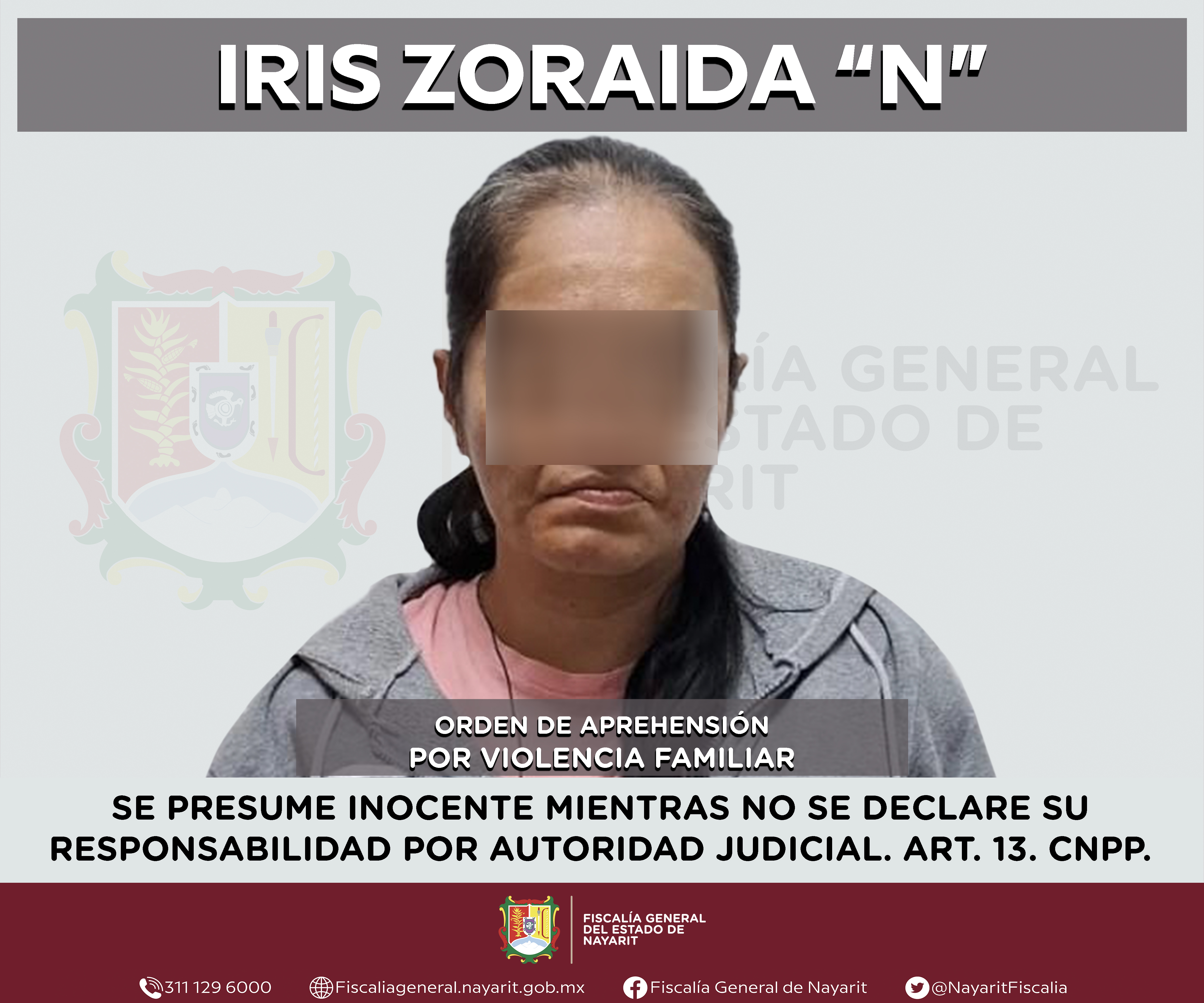 La Fiscalía General de Nayarit a través de la Agencia de Investigación Criminal ejecutó una orden de aprehensión en la ciudad de Tepic contra Iris Zoraida “N”, por su probable participación en hechos que para la ley configuran el delito de viol...