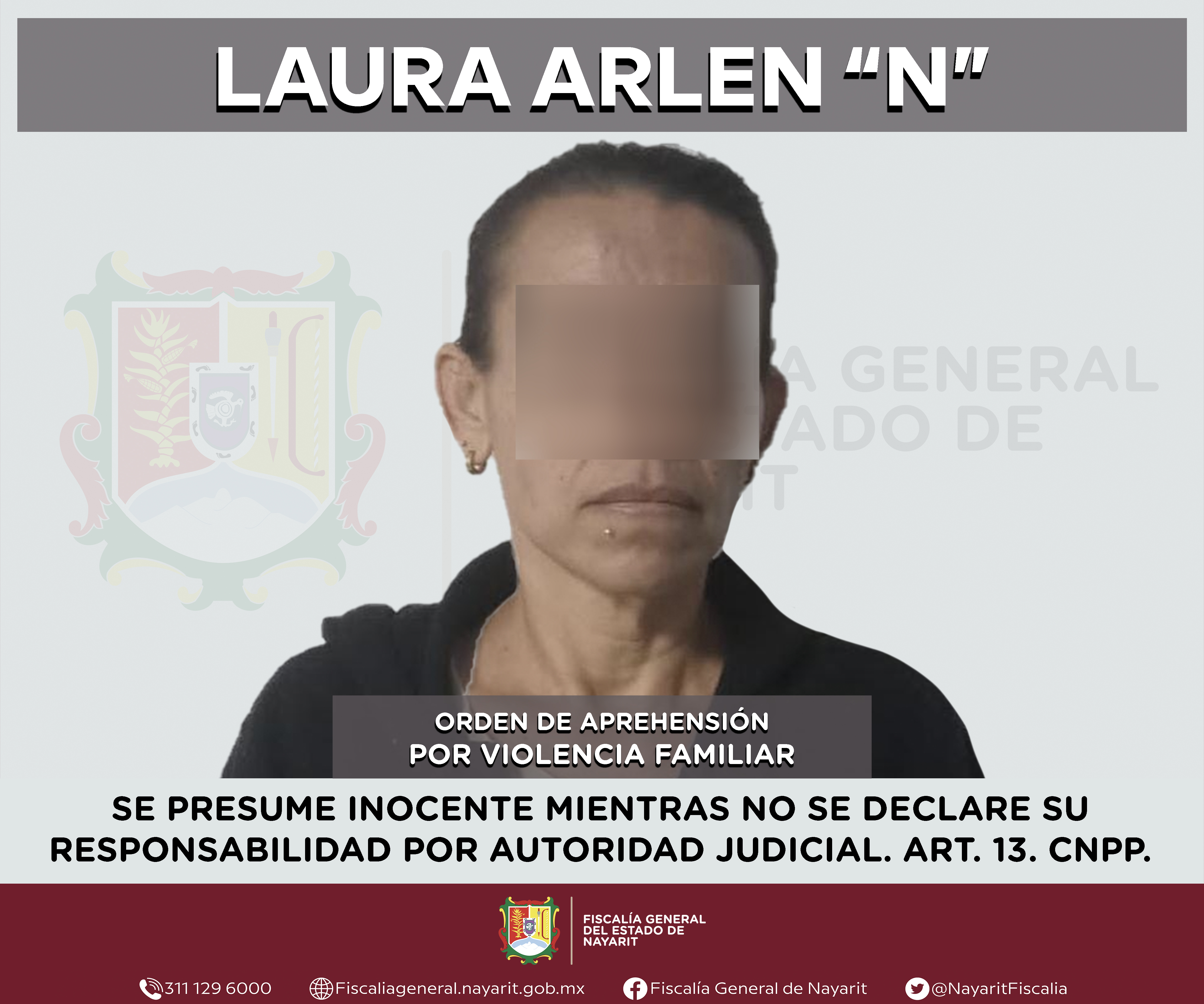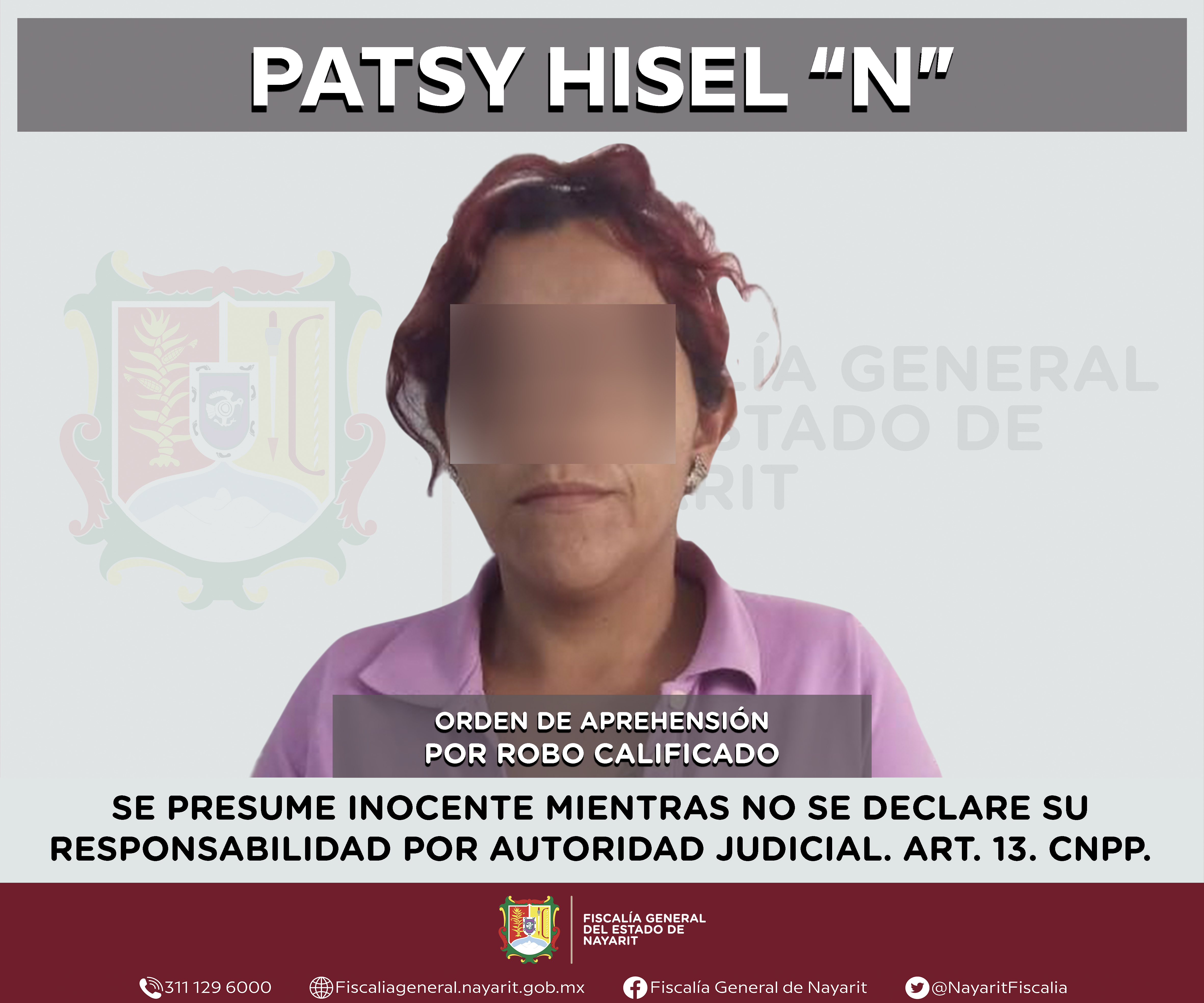 La Fiscalía General de Nayarit a través de la Agencia de Investigación Criminal ejecutó una orden de aprehensión en la ciudad de Tepic contra Patsy Hisel “N”, por su probable participación en hechos que para la ley configuran el delito de robo ...