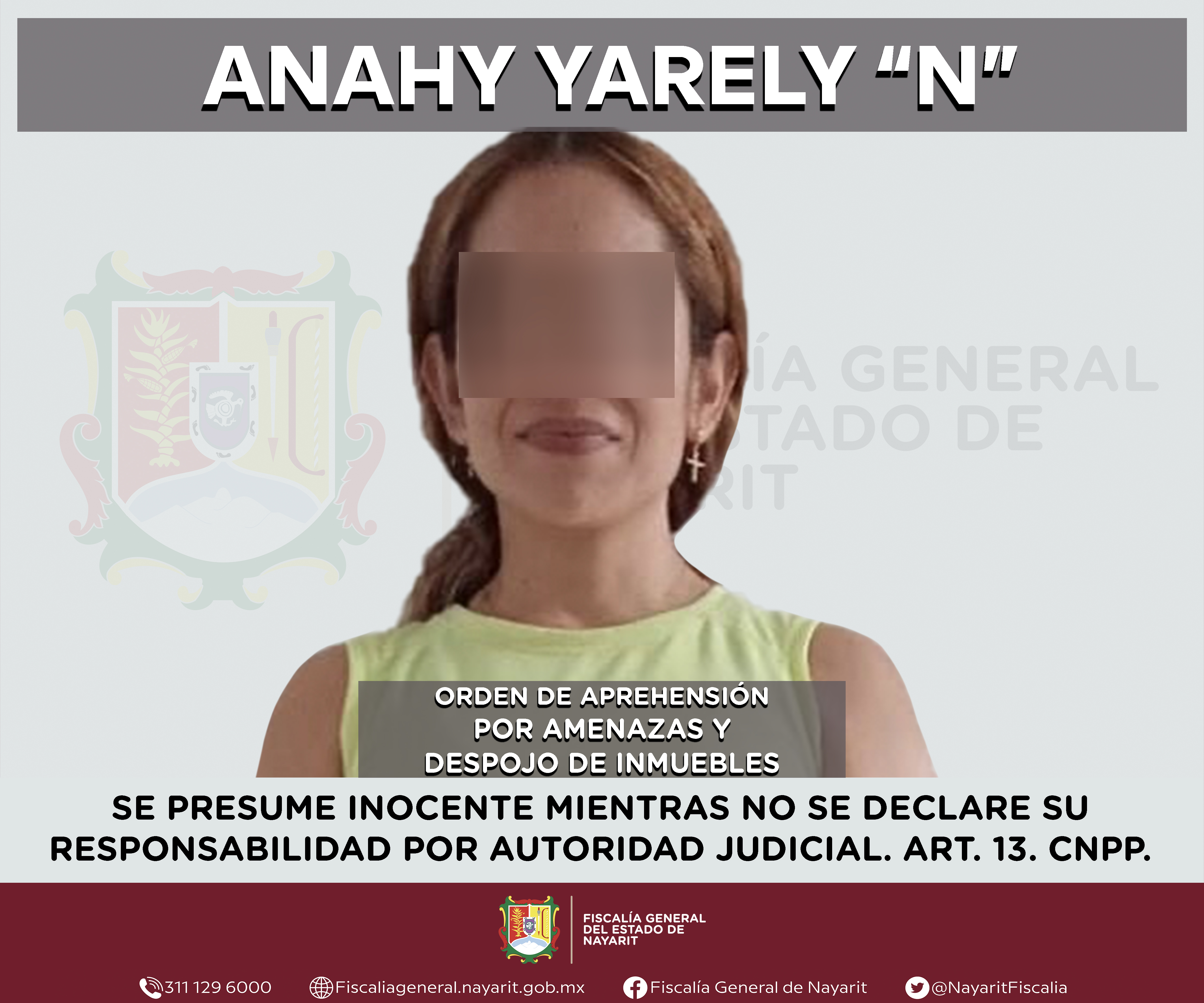 La Fiscalía General de Nayarit a través de la Agencia de Investigación Criminal ejecutó una orden de aprehensión en la localidad Las Varas, municipio de Compostela contra Anahy Yarely “N”, por su presunta participación en hechos que según apre...