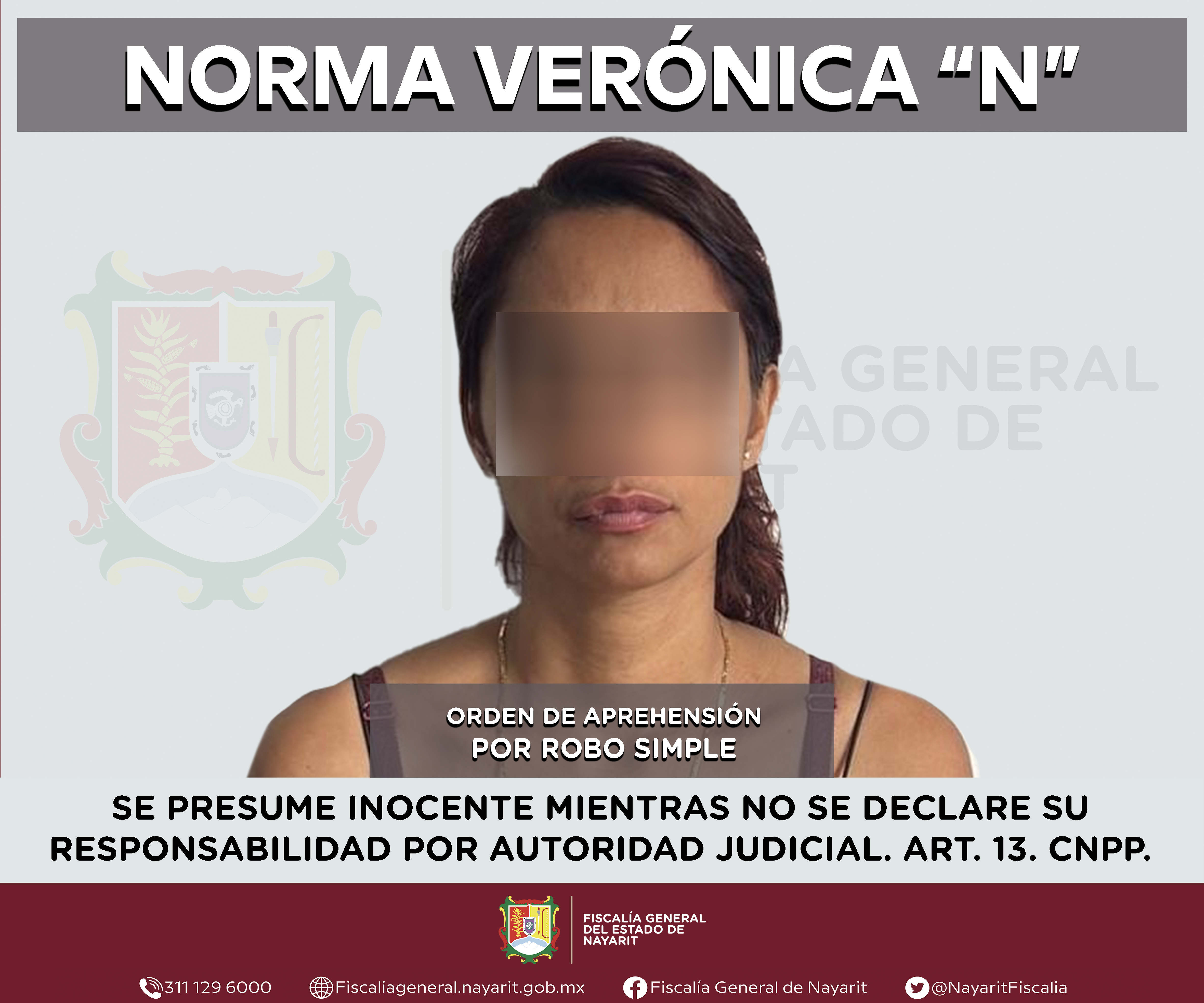 \r\nLa Fiscalía General de Nayarit a través de la Agencia de Investigación Criminal ejecutó una orden de aprehensión en la ciudad de Tepic contra Norma Verónica “N”, por su probable participación en hechos que para la ley configuran el delito ...