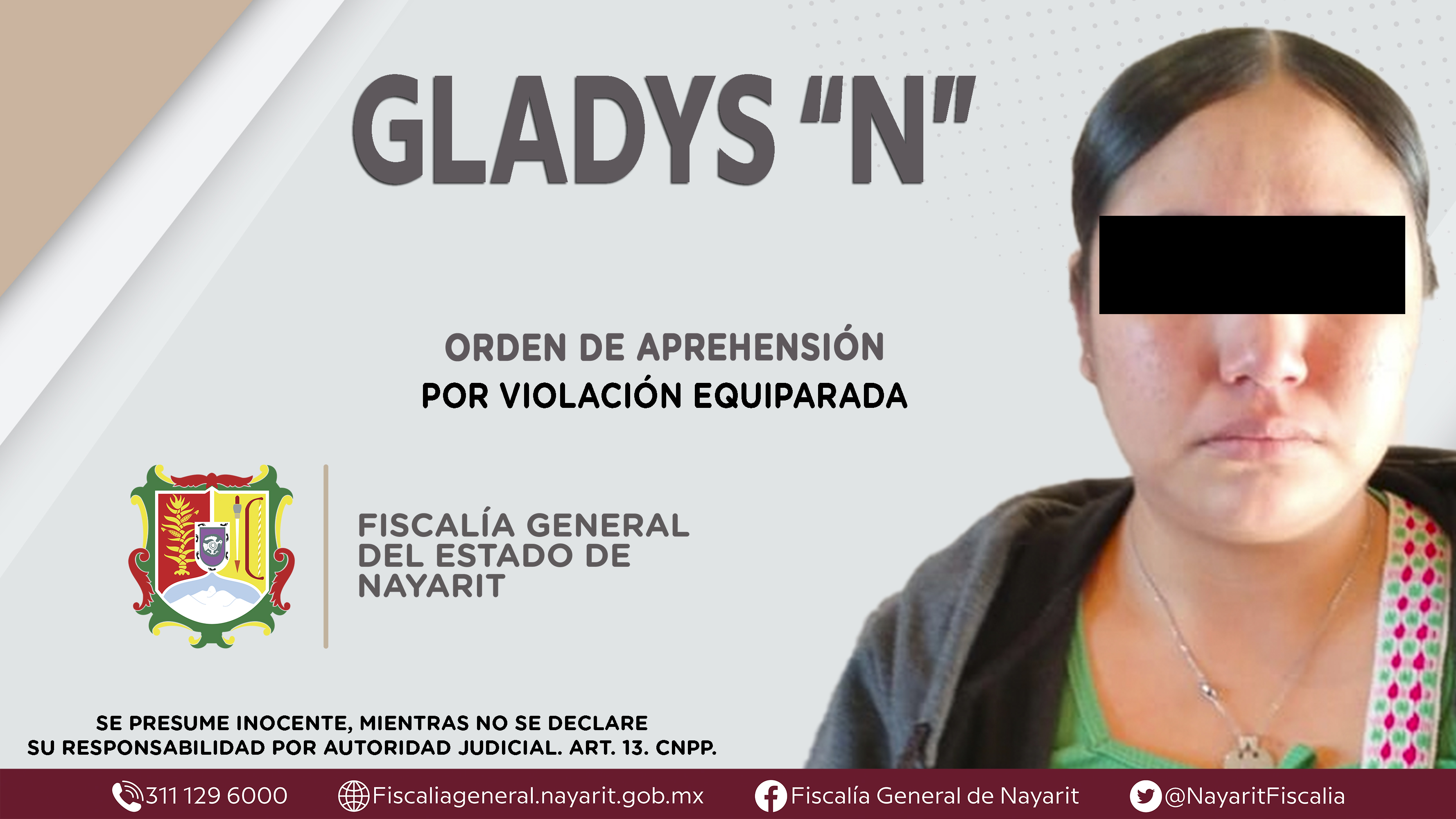 La Fiscalía General de Nayarit a través de la Agencia de Investigación Criminal dio cumplimiento a una orden de aprehensión en la localidad Jesús María, municipio Del Nayar contra Gladys “N”, por su presunta participación en hechos que según ...