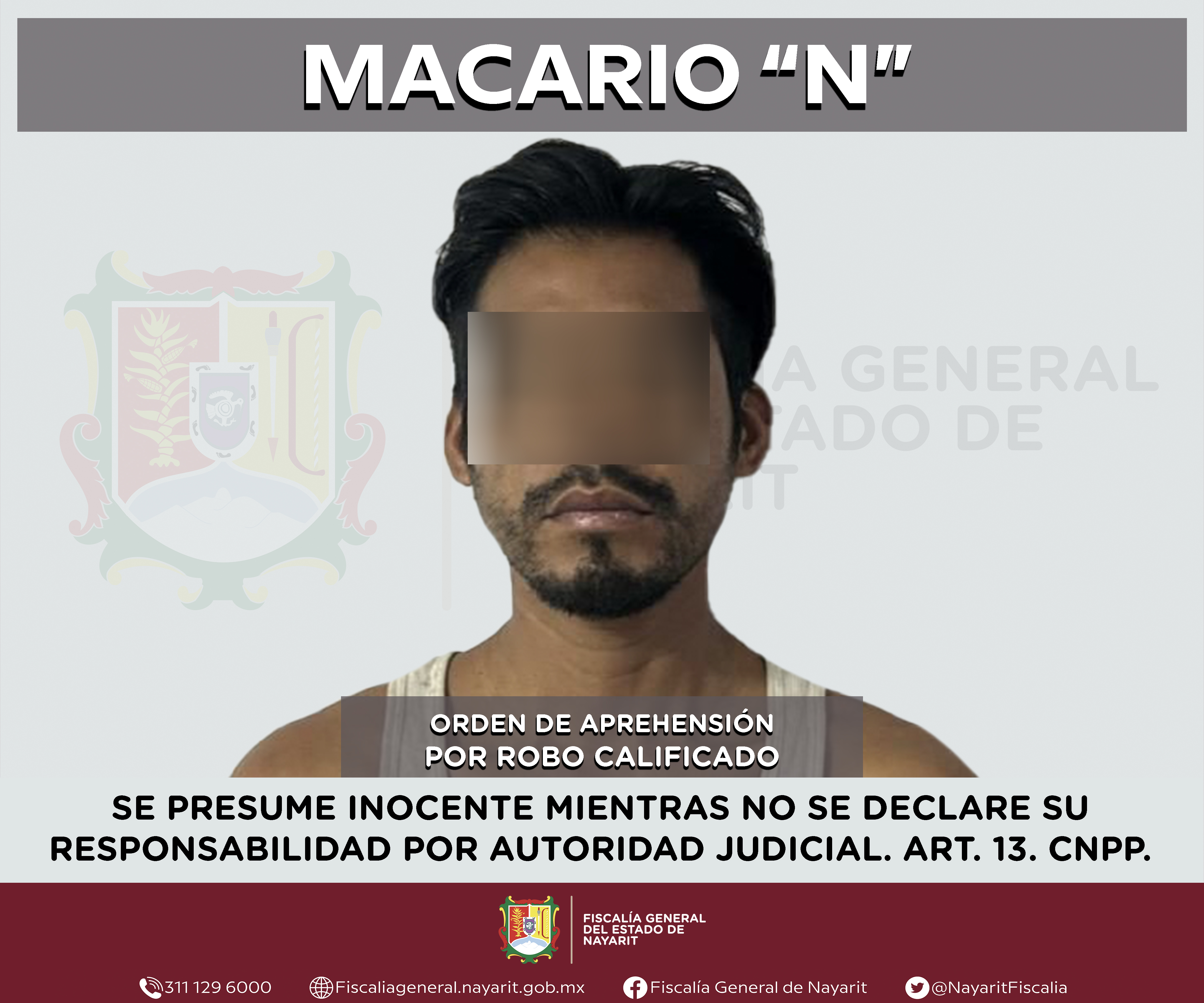 Elementos de la Agencia de Investigación Criminal de Nayarit ejecutaron una orden de aprehensión en la capital nayarita contra Macario “N”, por su presunta participación en hechos que según apreciación de la ley encuadran el delito de robo calif...