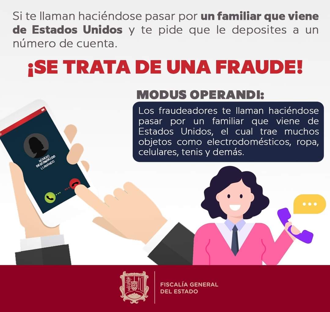 • Los fraudeadores te llaman haciéndose pasar por un familiar que viene de Estados Unidos, el cual trae muchos objetos como electrodomésticos, ropa, celulares, tenis y demás.\r\n\r\nTepic, Nayarit; 3 de enero de 2022.- Derivado de diversas denunci...