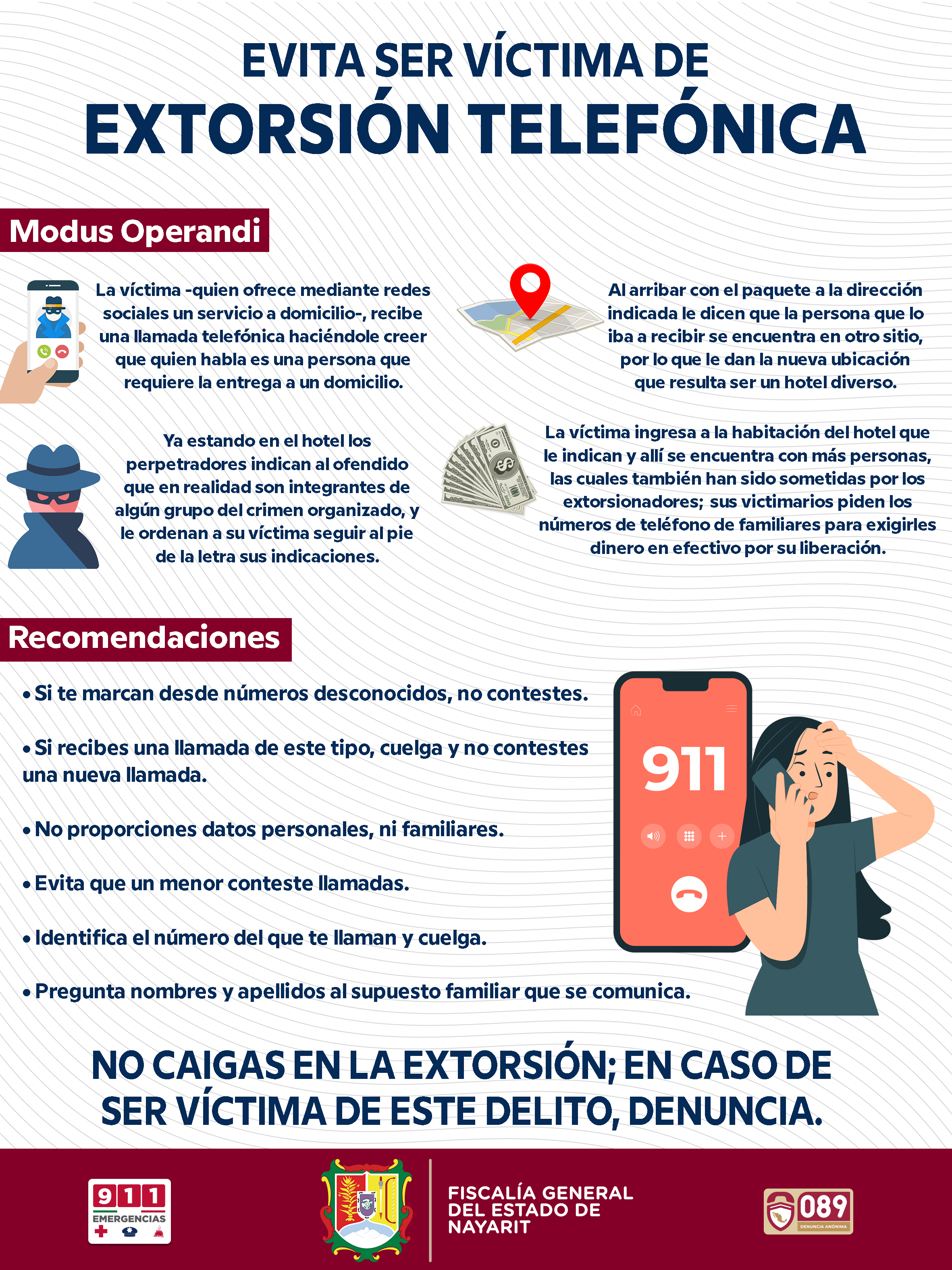 • Las llamadas de extorsión regularmente las realizan internos desde penales federales\r\n\r\nTepic, Nayarit; miércoles 26 de junio de 2019.- La Fiscalía General del Estado exhorta a la sociedad en general a no ser víctima de delincuentes que media...