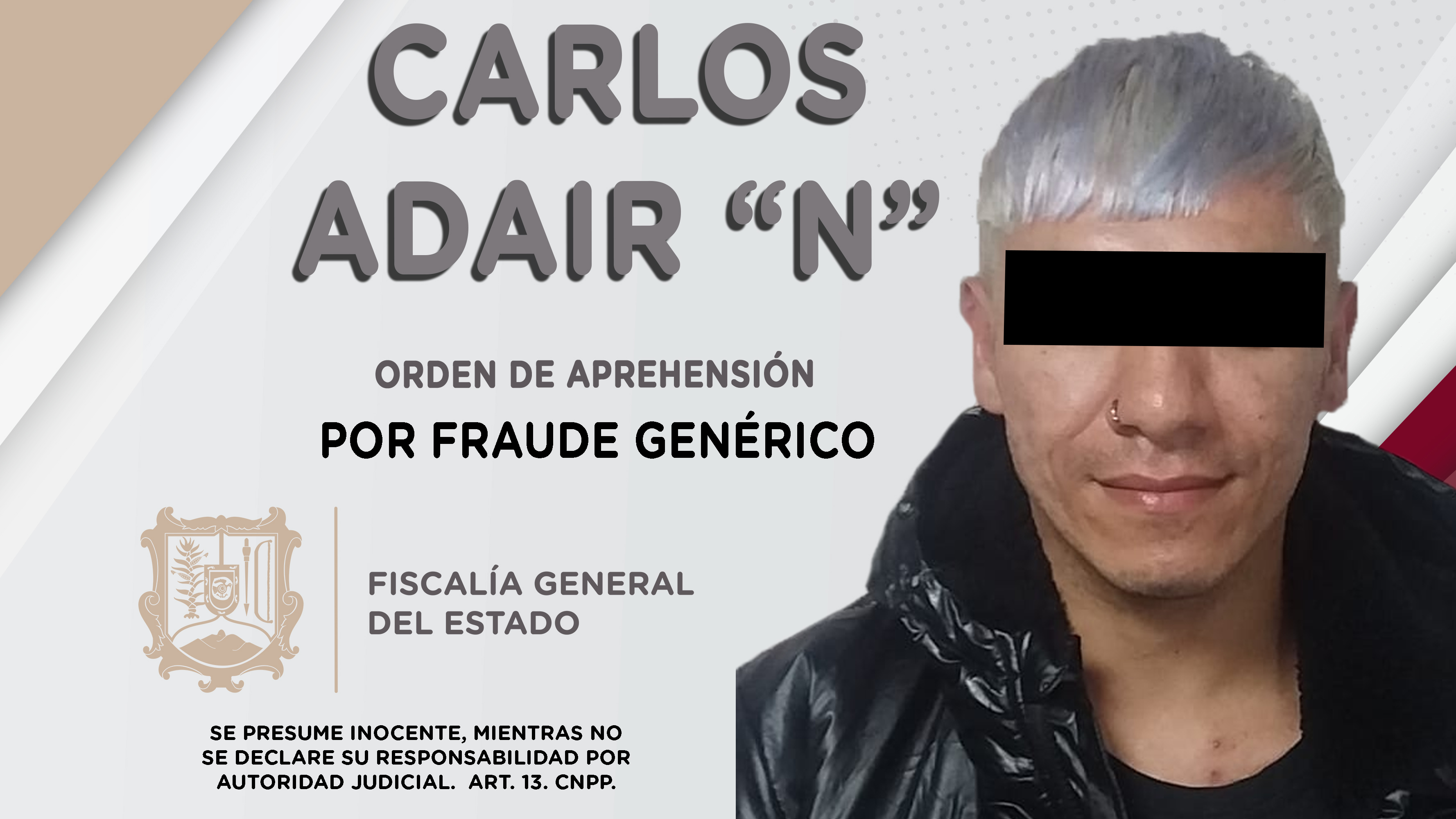 Tepic, Nayarit; 27 de noviembre de 2021.- Fiscalía General del Estado solicitó a la Organización Internacional de Policía Criminal (INTERPOL), la apertura de alerta migratoria y ficha roja en contra de Carlos Adair “N”, por ser presunto autor de ...