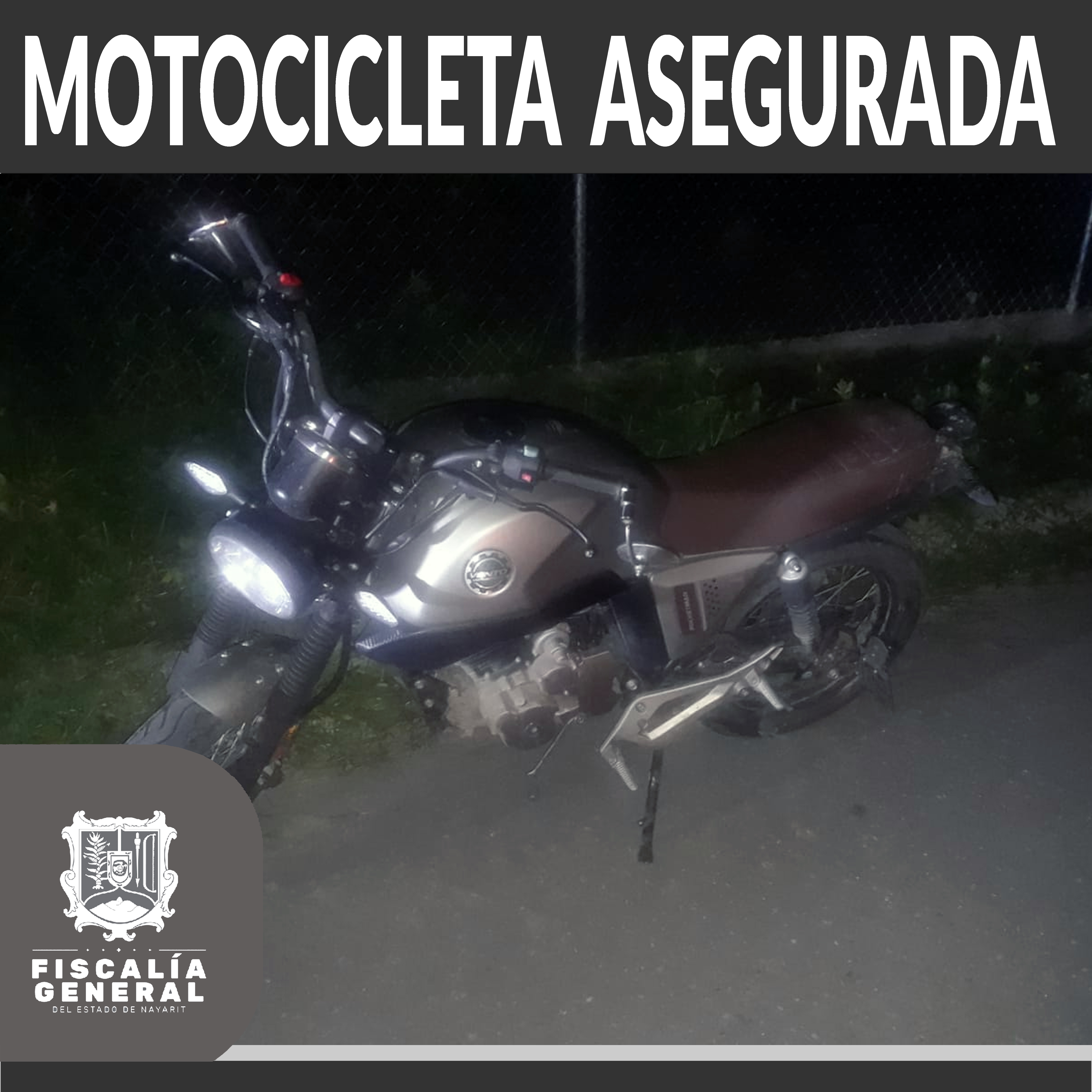 Policías adscritos a la Agencia de Investigación Criminal del municipio de Xalisco aseguraron una motocicleta en la colonia “Navarreño” de dicho municipio, el cual tiene reporte de robo vigente. La unidad en mención es de la marca Vento, color gr...