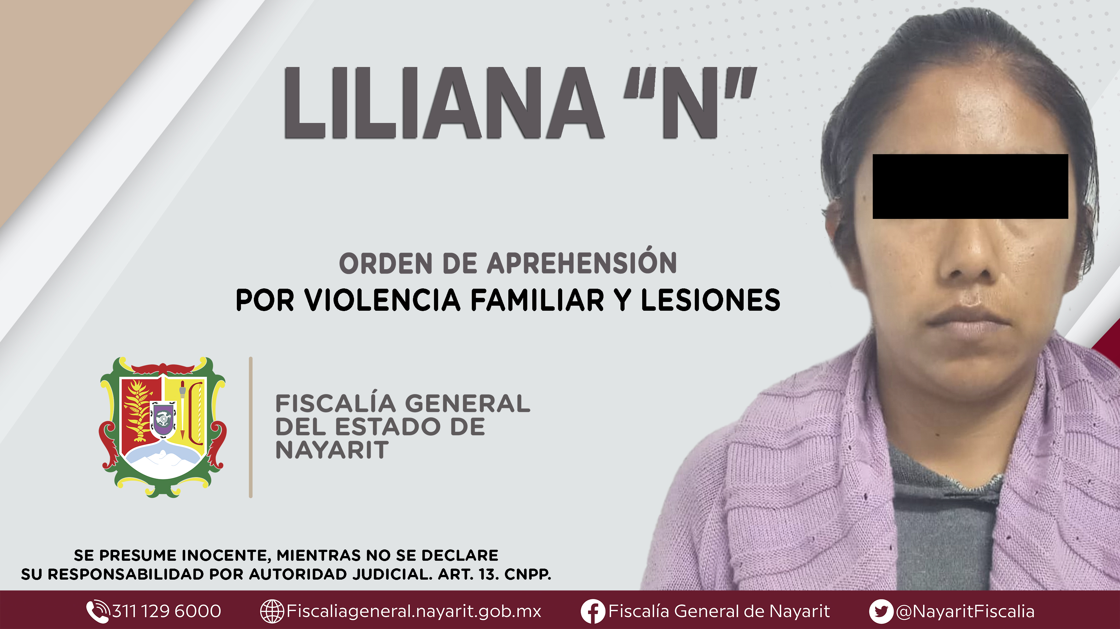 Elementos de la Agencia de Investigación Criminal dieron cumplimiento a una orden de aprehensión en la ciudad de Tepic contra Liliana “N”, quien es originaria y vecina de la capital nayarita, por su presunta participación en hechos que bajo la apr...